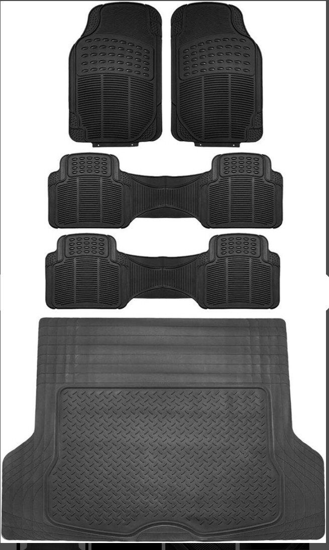 VenmoPackage Includes: 2 Front Floor Mats, 2 Rear Floor Mat and 1 Cargo Mat Dimensions- Floor mats: Front 26" x 18", Rear 13" x 15.5"; Cargo liner: 44"L x 54.5"W Material: Rubber/ Vinyl; Cleaning tip: Vacuum or use soap and water. Air dry Trimmable design to fit your vehicle for ultimate protection Heavy nibbed backing secures mat in place; Waterproof and stain-resistant.