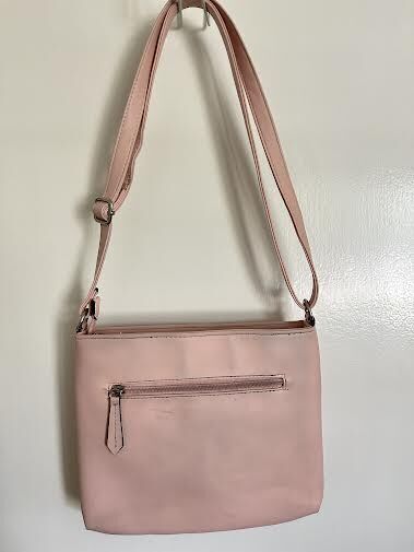 VenmoLondon Fog faux leather cross body pale pink purse. Cross buckle strap design on front, zipper pocket closure on back. Zipper top closure. Fabric interior with one zipper pocket and two slot pockets. Adjustable strap. Silver tone hardware. Measures 11” x 9”. Excellent like new condition