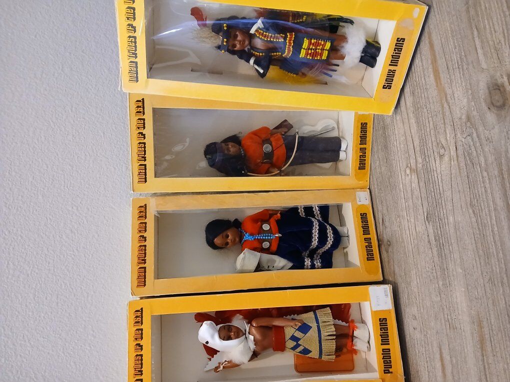 1970s heritage dolls Pine Ridge, South Dakota. hand beaded. the plastic on the fronts is ripped ot gone on some. dolls are in great shape still in the packaging 10 all together. one doll has an arm that fell off but is with it. $50.00 for all, or $7.00 each.