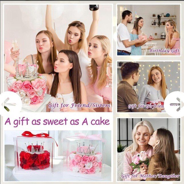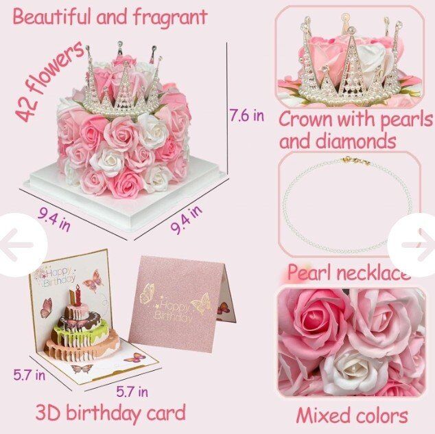 VenmoCLASSIC DESIGN The fake birthday cake with cake shape are designed by Eightown,there are 42 eternal roses full of the cake,it s made of soap,long lasting like 2 years and smells good,the silver crown makes the roses exquisite gift for all ages.
