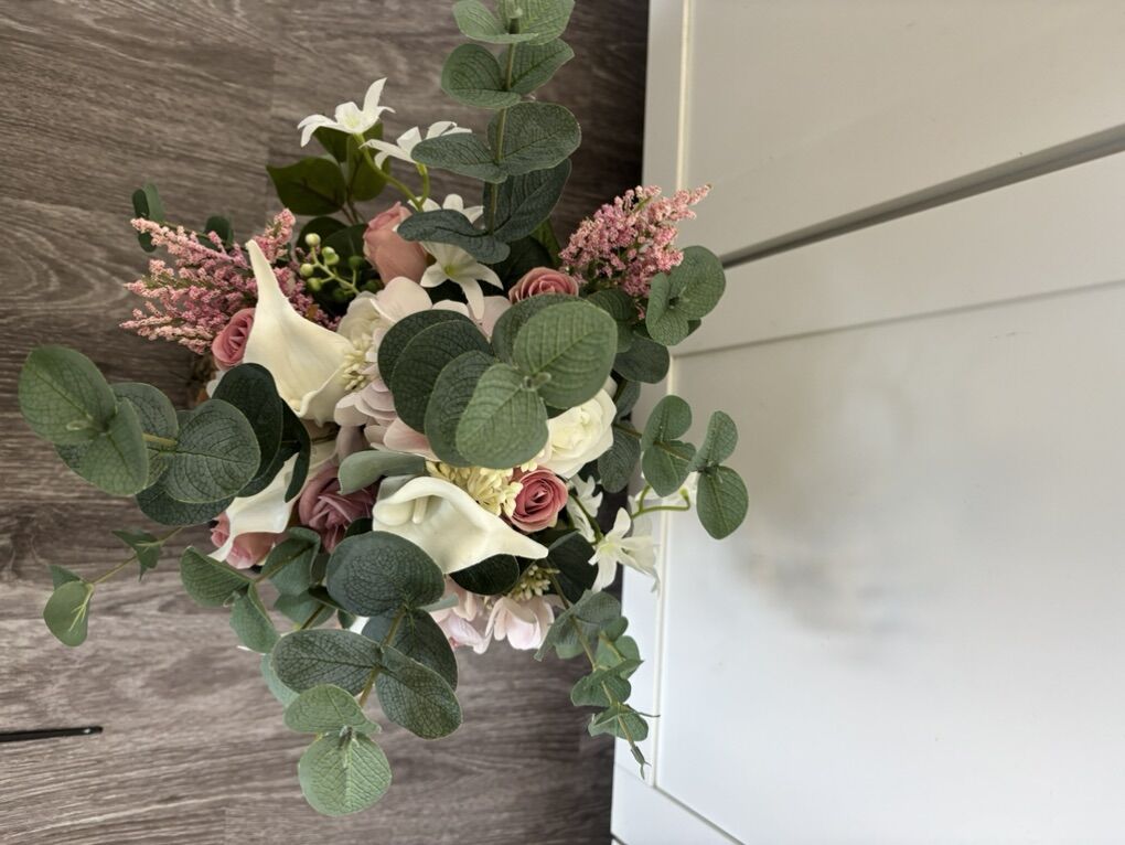 Venmo21” long x 16” diameter, artificial flowers and greenery, dusty rose, white and pink . Cala Lilies , roses. For purchase. Pick up in Layton.