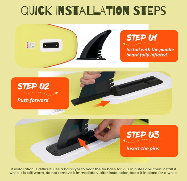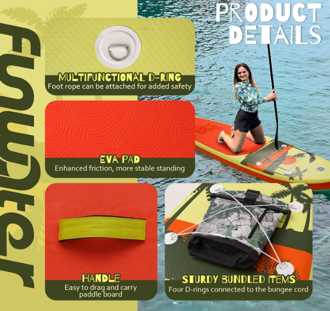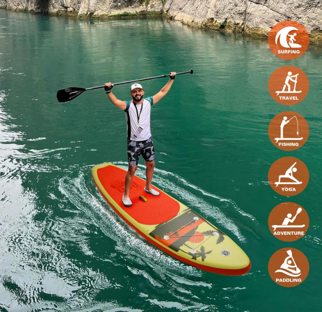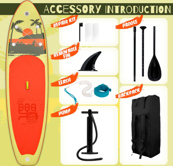 Package Including1 inflatable paddle board, 3-piece length-adjustable floating paddle ,1 removable fin , 1 SUP pump, 1 backpack ,1 leash