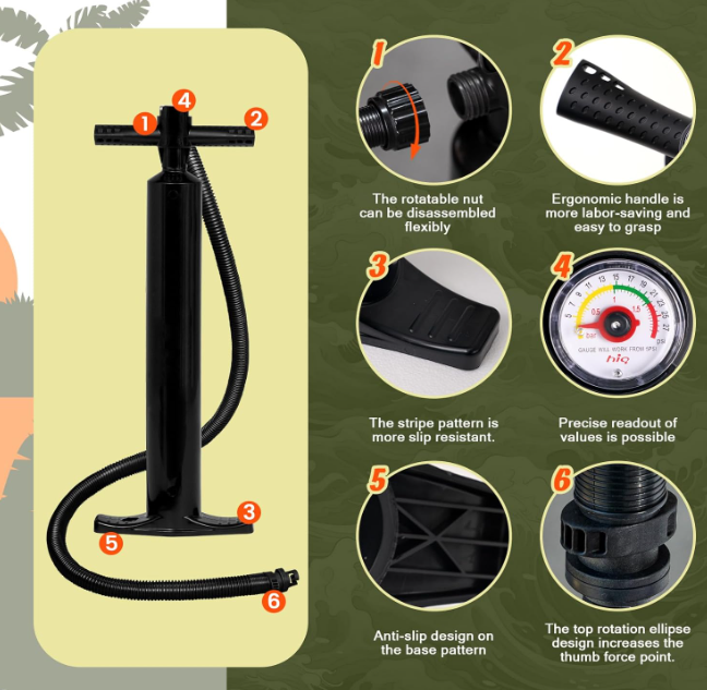 Design and UseThis unique ergonomic handle design allows you to inflate your paddle more easily in a shorter time.The multifunctional elastic string can tightly fix any objects placed on the stand up paddleboard