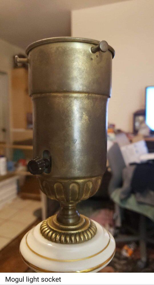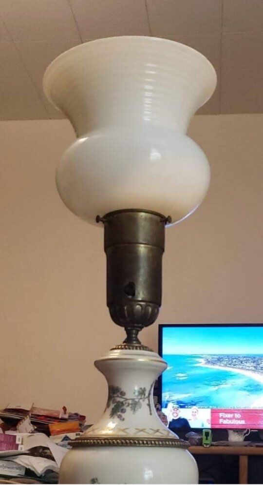 PayPalVintage Paul Hanson table lamp, likely from the Mid-Century Modern (MCM) Hollywood Regency era, characterized by its brass and hand-painted porcelain construction. Fitted with a mogul socket for use with three way mogul bulb.
