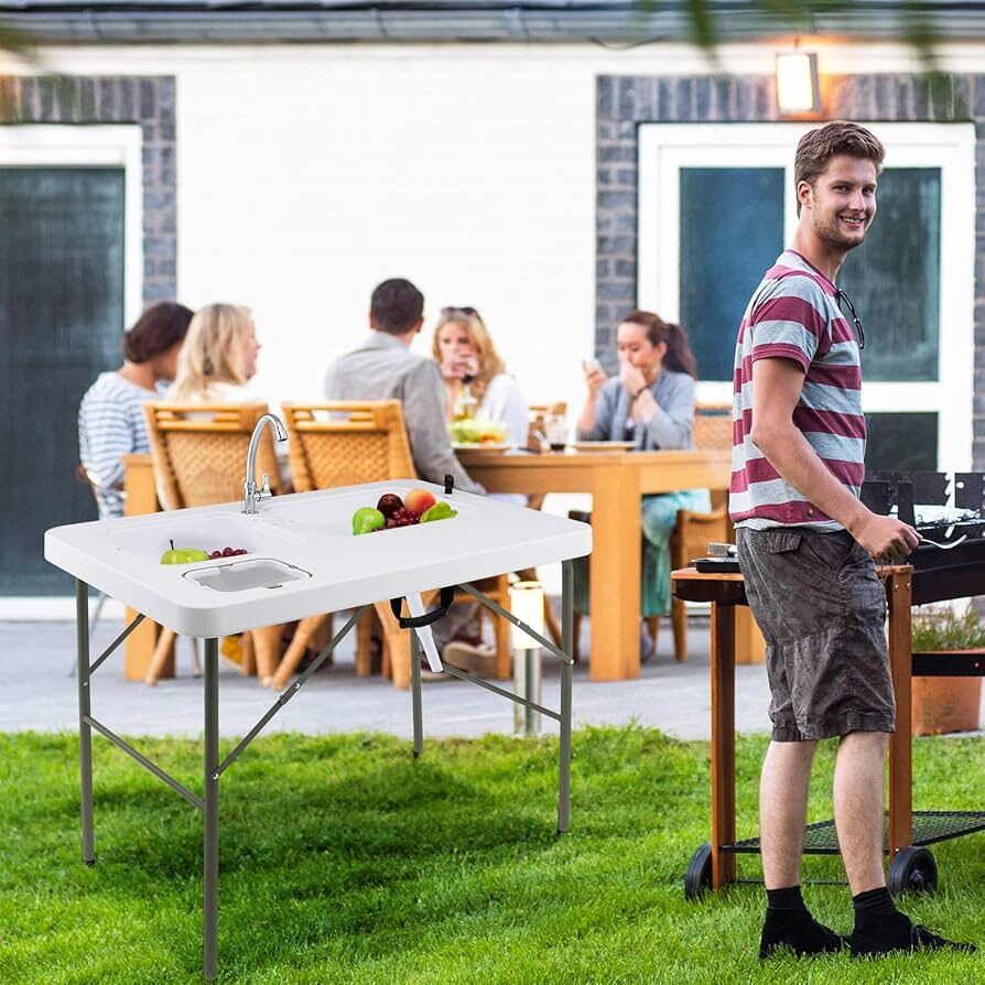 New in Box!!! •Supported by a sturdy, rust-resistant steel frame with a reinforced triangular structure and anti-scratch pads, this fish cleaning table boasts a strong load-bearing capacity of 330 •360° Swivel Water Faucet & 2 Sinks: When connected to a standard garden hose (not included), the 360° swivel water faucet will provide enough water for 2 sinks from different angles, making cleaning fish and vegetables a breeze. The 2 telescopic water drain hoses are also very convenient.