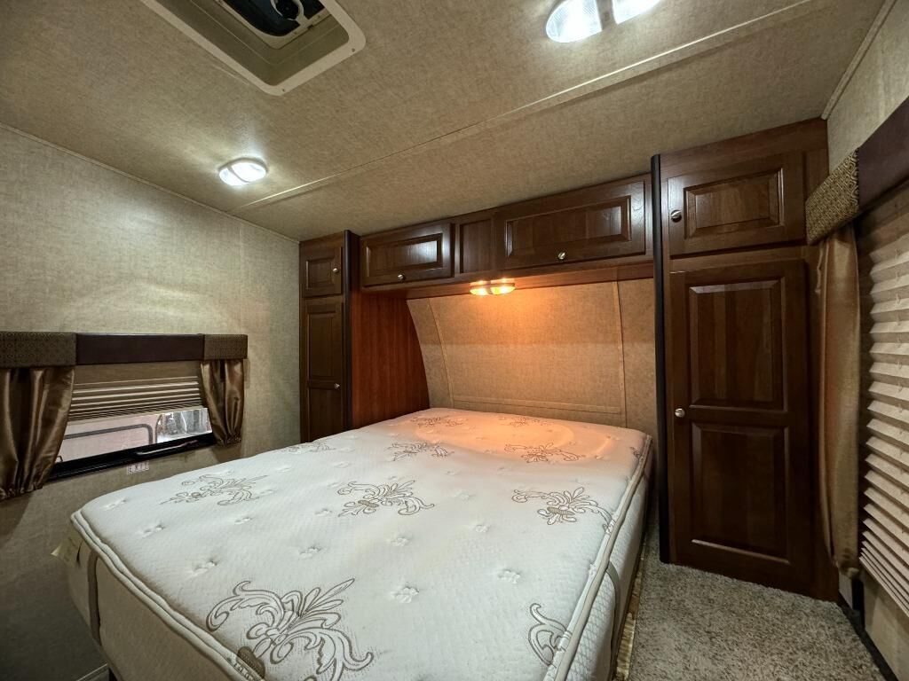 The front bedroom features a queen size bed with closets on either side, an overhead storage cabinet, and convenient laundry chute.