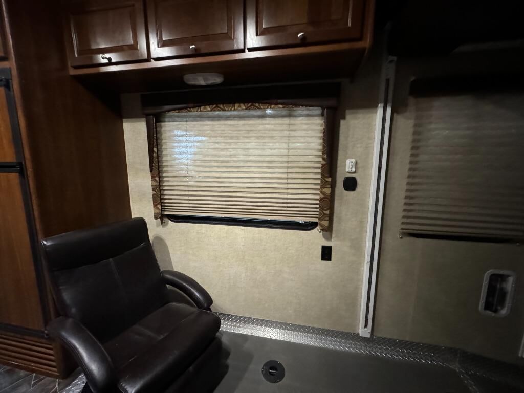 The rear 8' garage door will make loading and unloading a cinch. There is a single electric lift bed/combo couch in the rear for more seating and sleeping space once the cargo is removed. There is also a flip-out sofa/bed with overhead cabinet and dinette table for use at mealtimes too.