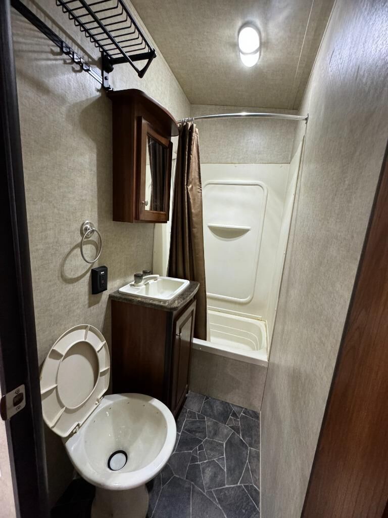 Prepare and cook all of your meals and snacks easily with a three burner range, double kitchen sink, refrigerator, and pantry for storage. There is also an overhead cabinet for dishes and things.
