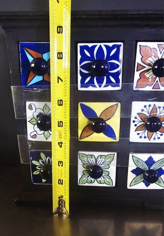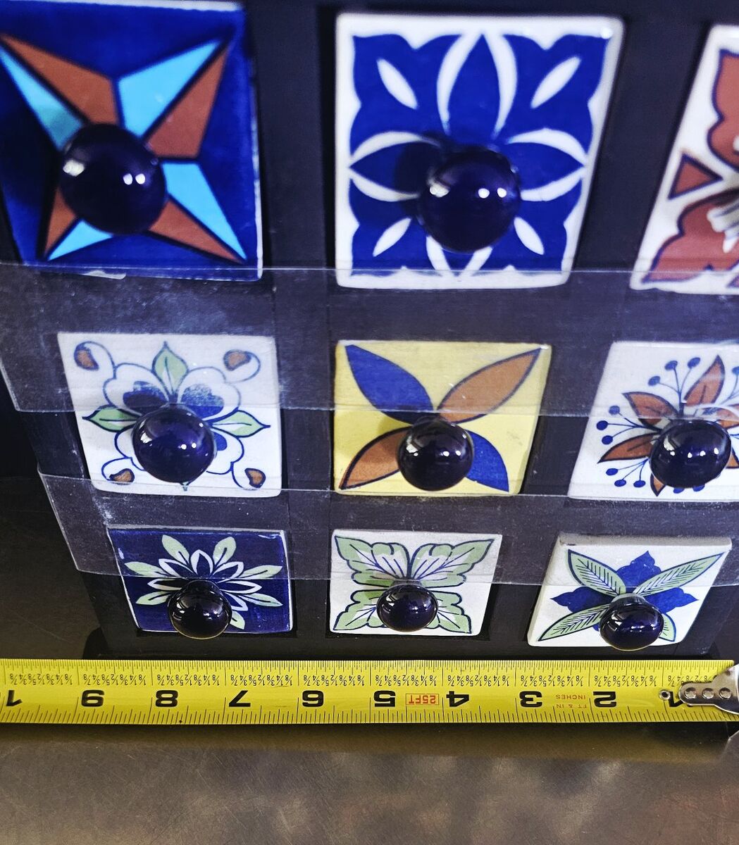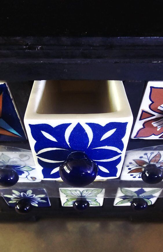 This is very vintage - BUT NEW - & still has the original bands from the maker. Nine unique ceramic drawers incased by solid wood. HIGHLY ORNATE & COLORFUL!!. Would make a GREAT GIFT!!