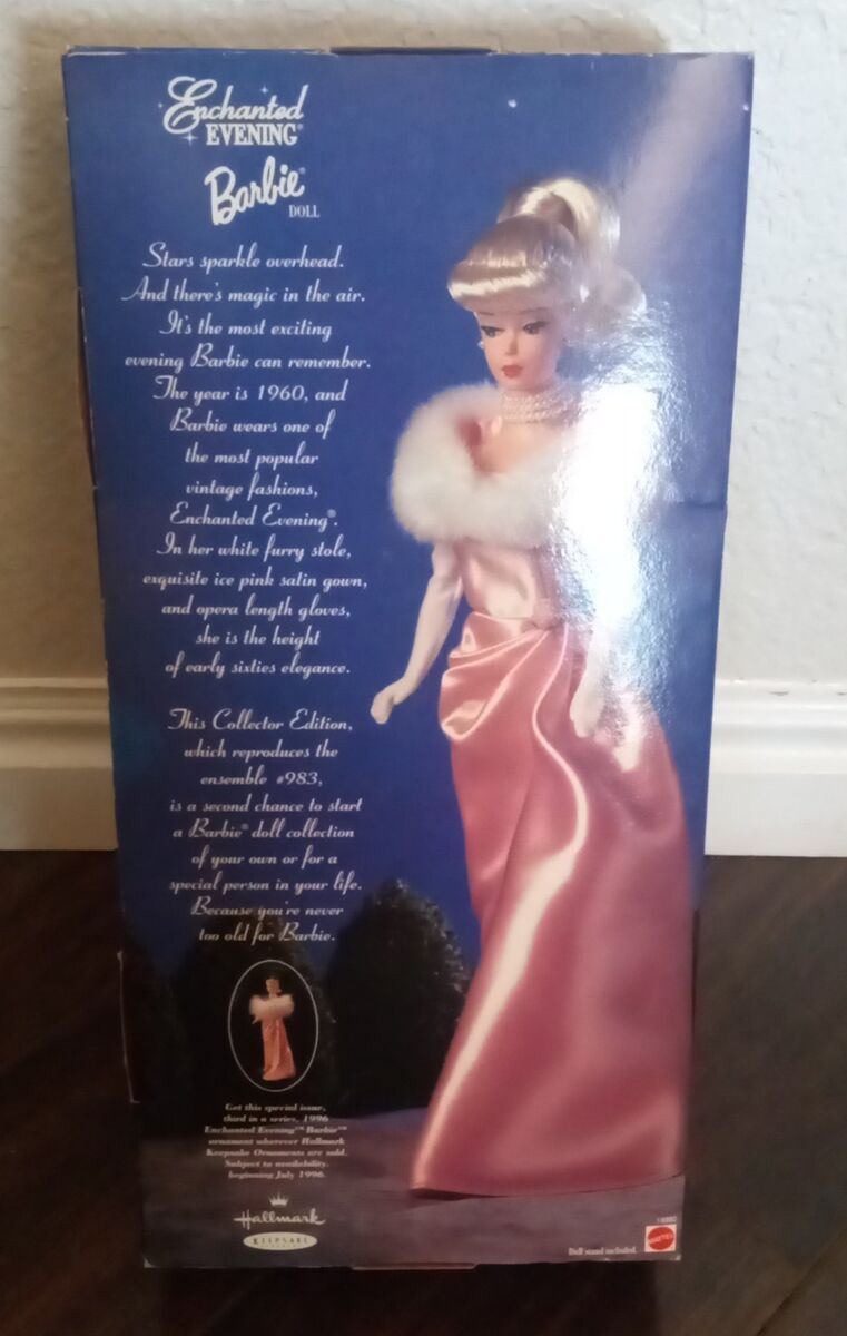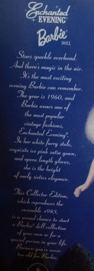 This is a Enchanted EVENING® Barbie® it is a Colecters edition, the box has been opened by the previous owners but it still had every thing the brush and stand are still inside every thing is intact and works.