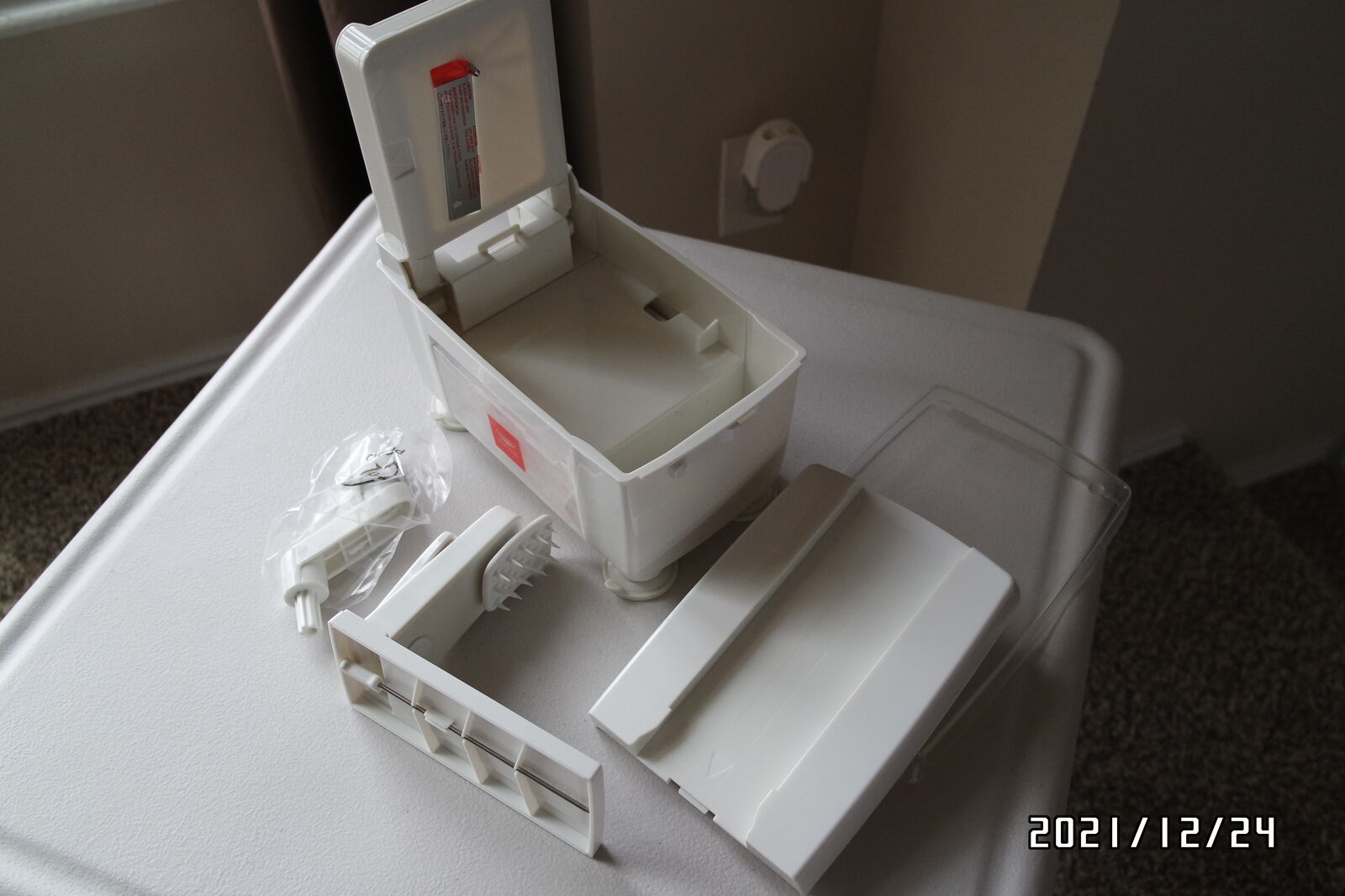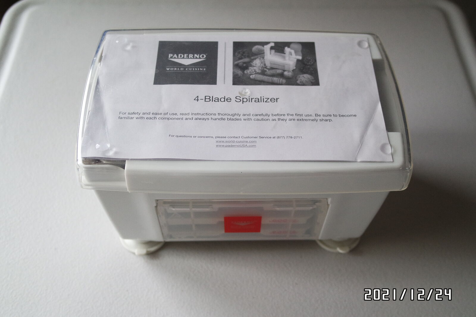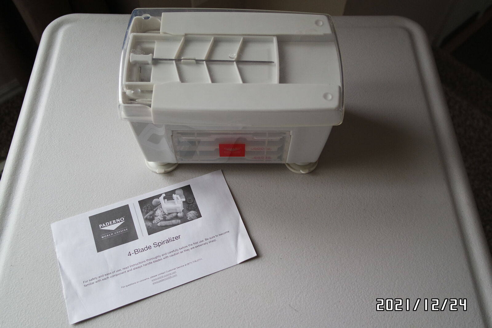 Venmo"New" never use About this item Easily and quickly slice and spiralize large quantities of fruits & vegetables instead of using a knife. Includes: 1 x Vegetable spiralizer / slicer plus 4 blades: 1 x Straight blade (1/8") for ribbons and accordion cuts, 3 x Julienne blades (1/8", 1/4" & 3/32") for vegetable strands & zucchini noodles. Smart design. Spiralizer takes up minimal space while stored due to folding design and a separate holder which houses the extra blades. Suction Base. Mount to any clean & non-porous surface with absolute ease due to its powerful suction base. Patented design. Made of heavy-duty BPA-free ABS plastic. Dishwasher safe on top shelf.