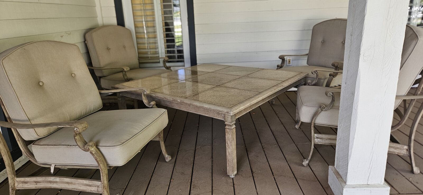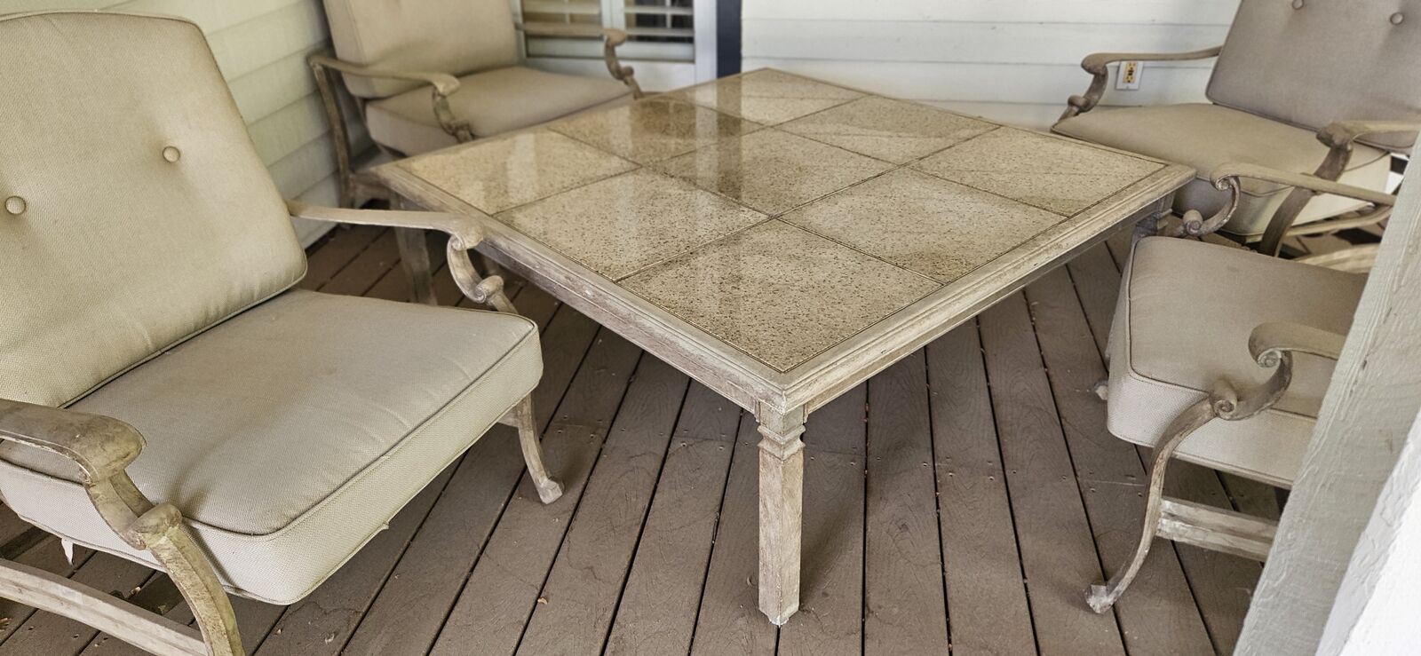 This is a gorgeous patio Table & Chair set. High end Marble table top. Includes 4 chairs. All Solid Sturdy furniture. Measures 52" square on top and 22" Tall. The price is right give me a call (801) 380-3390 Deb