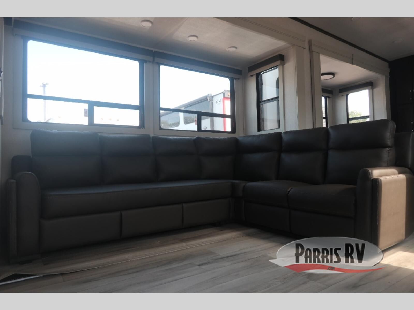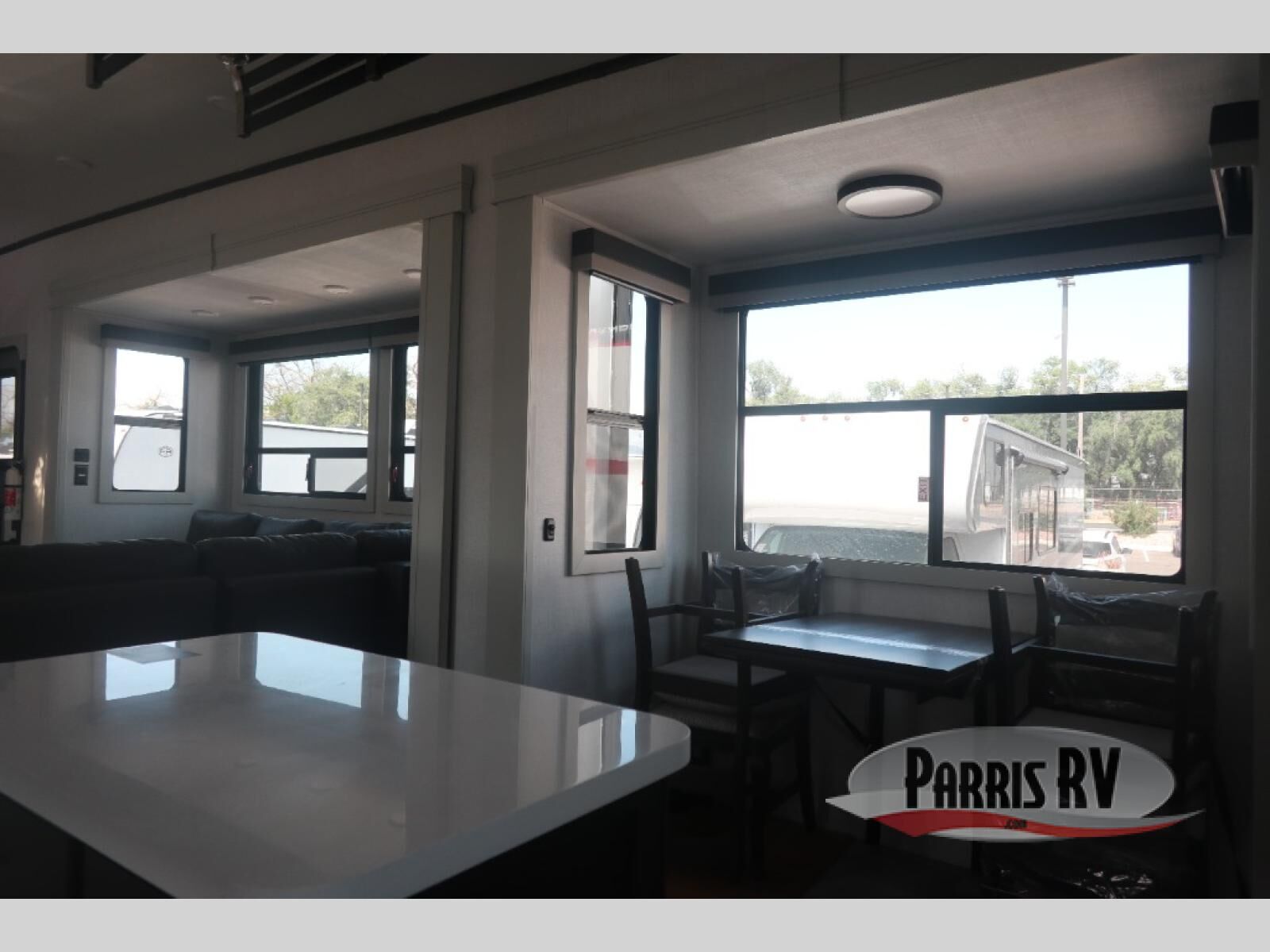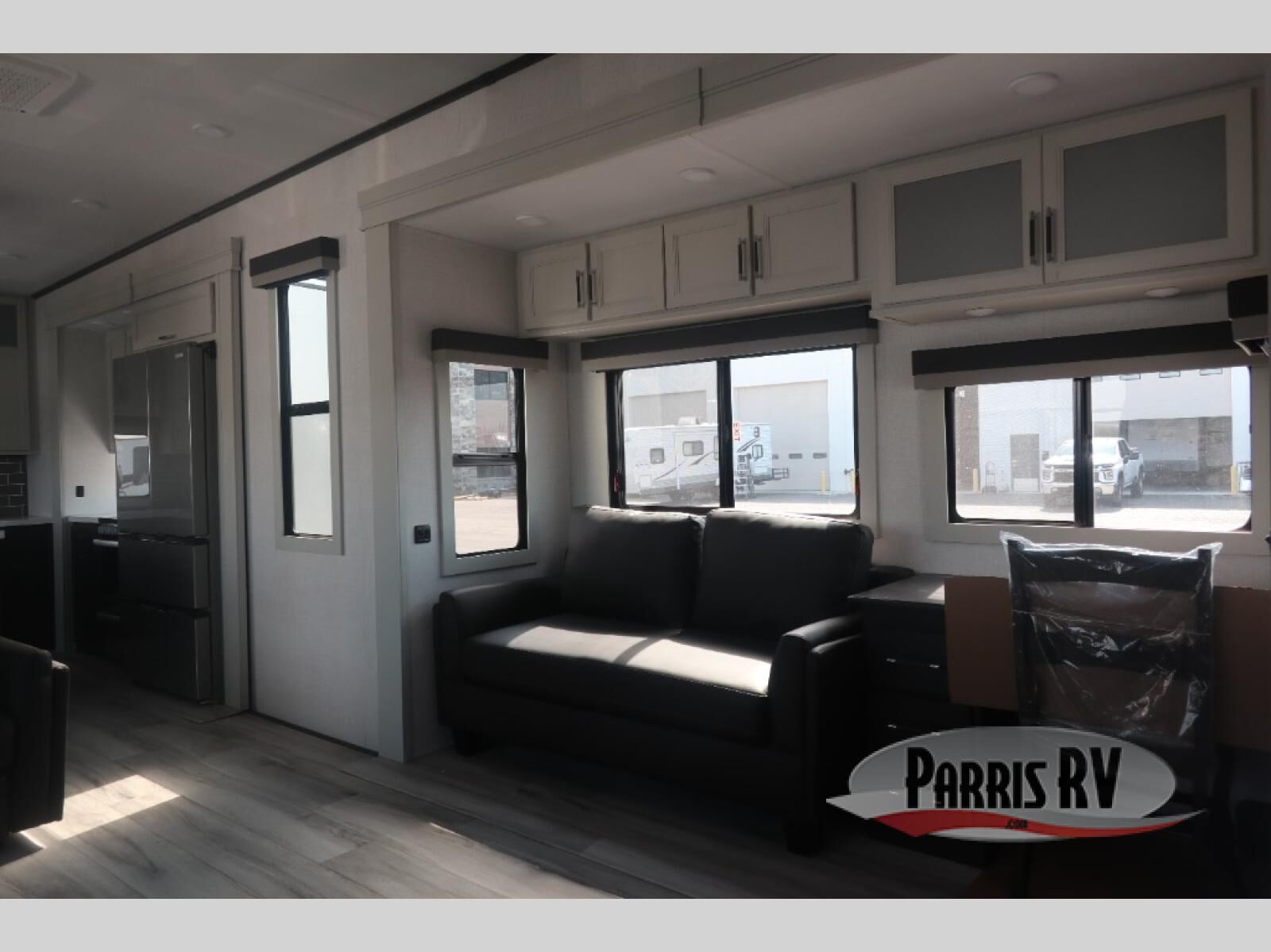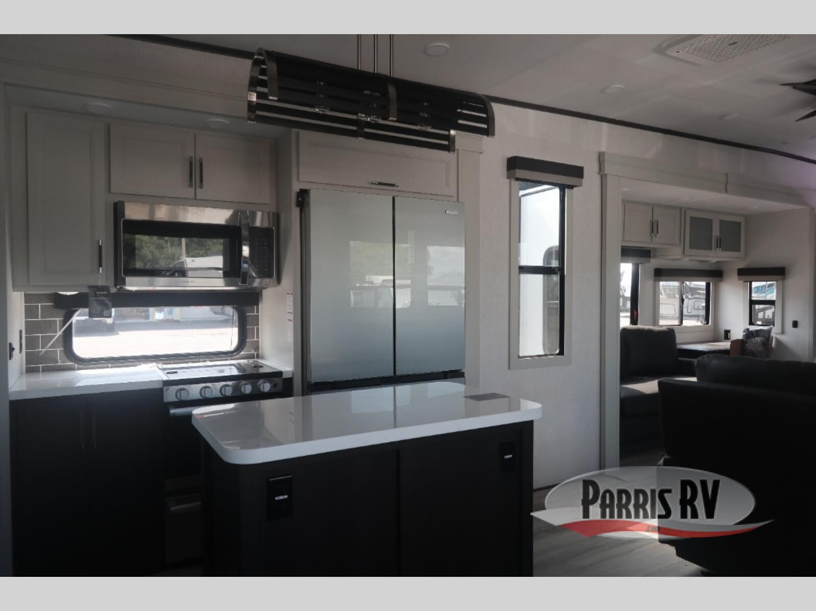 This rear kitchen fifth wheel makes extended stays or weekend trips to the lake enjoyable! The chef of your group will find plenty of counter space with the included kitchen island, plus there is a pantry and 18 cu. ft. residential refrigerator for food storage. A free-standing dinette provides a place to dine together, and the largest L-shaped sofa with recliners will be the perfect spot to relax with a movie. If you have guests, they could sleep here or on the hide-a-bed sofa sleeper. The dual entry bath includes a shower with a seat for added comfort, and the front master bedroom will feel just like home with its king bed slide out and master closet. There is also a dresser and stackable washer and dryer prep if you want to add those appliances!