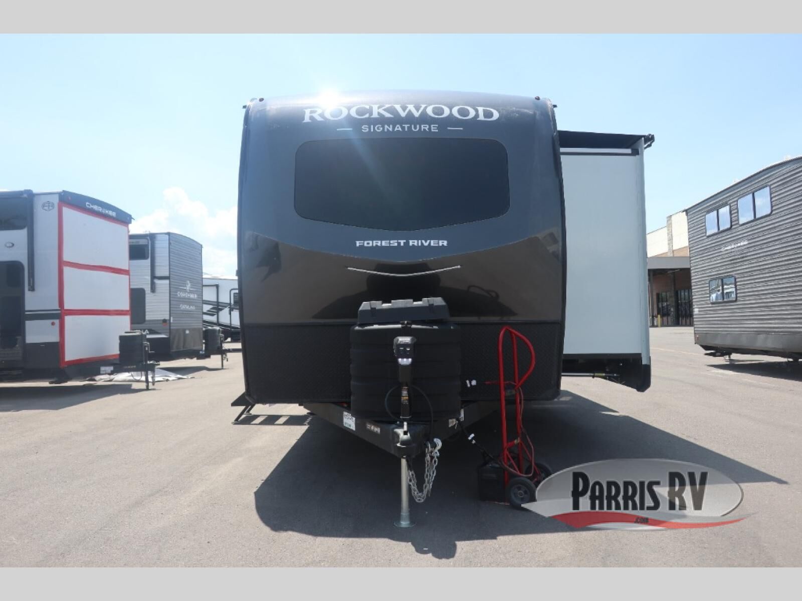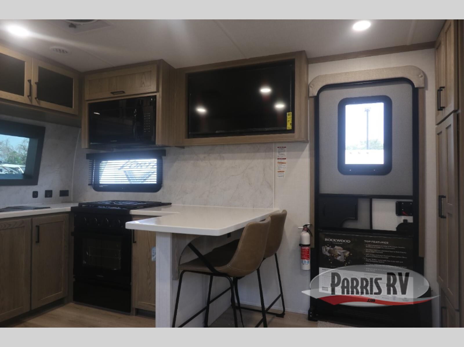 With any Rockwood Signature fifth wheel or travel trailer by Forest River RV, you will enjoy superior construction that includes laminated white fiberglass sidewalls, a radius roof with vaulted interior ceilings, plus radiant foil insulation and an enclosed underbelly for use in all types of weather. Some convenient exterior features include Keyed Alike locks, a rear ladder, a 200W solar panel, and a tire pressure monitor system with a monitor for added safety. The interior offers a One Touch OneControl panel with WeRV app control, for lights, awning, slides, water heater and more, and the Air 360+ omnidirectional antenna with WiFi prep lets you work while away from home if needed. You will also appreciate the interior vaulted ceilings, residential soft close doors and drawers, solid surface kitchen countertops, and designer kitchen backsplash!