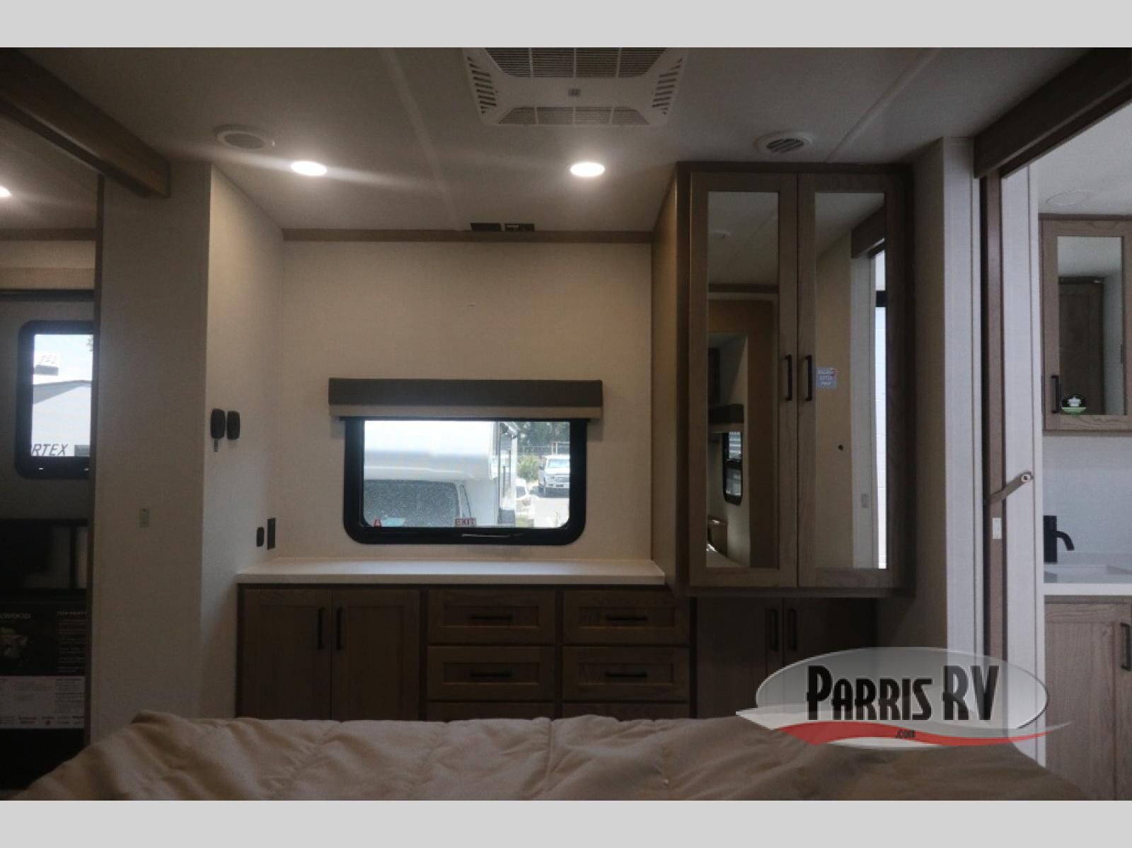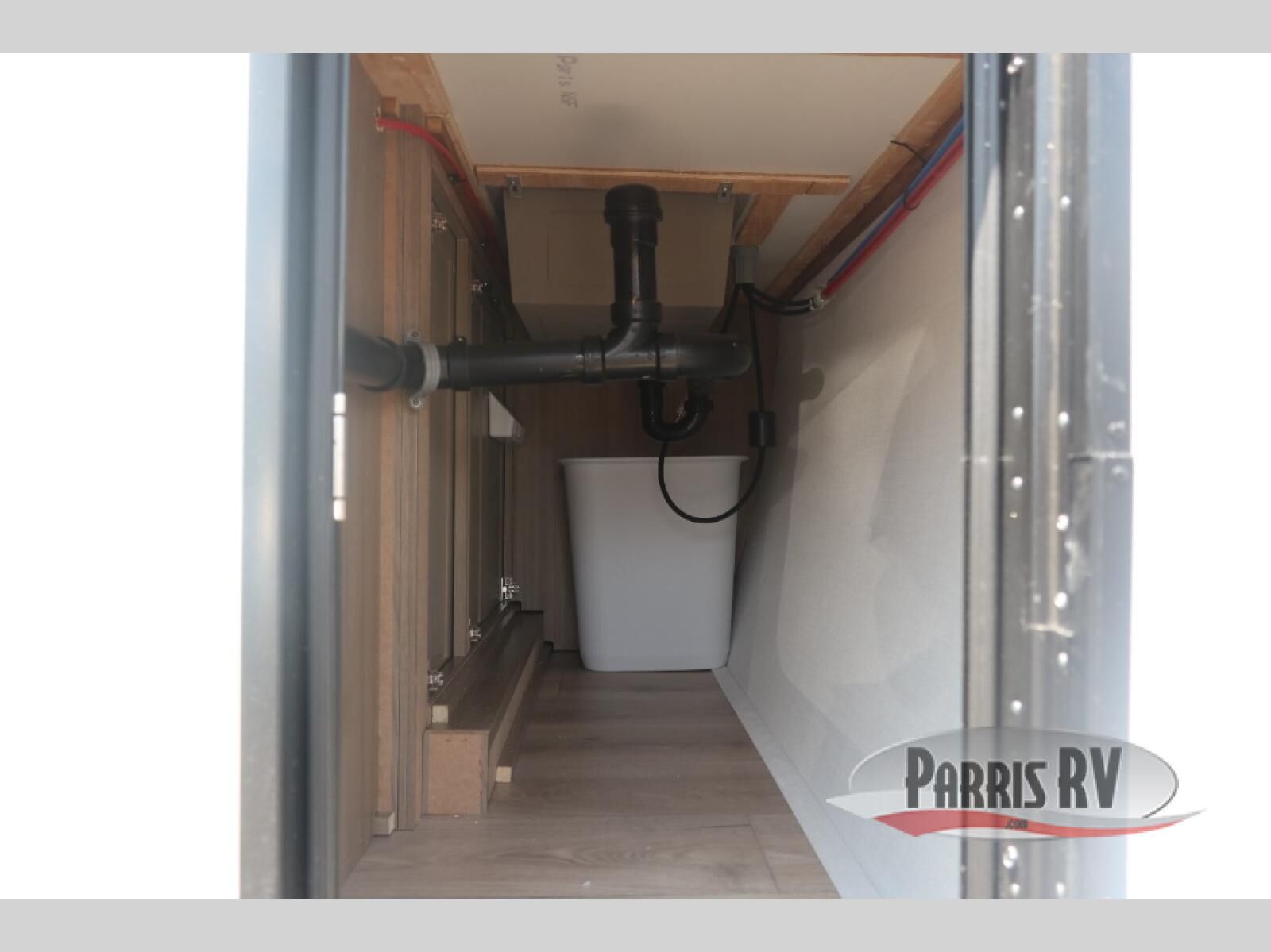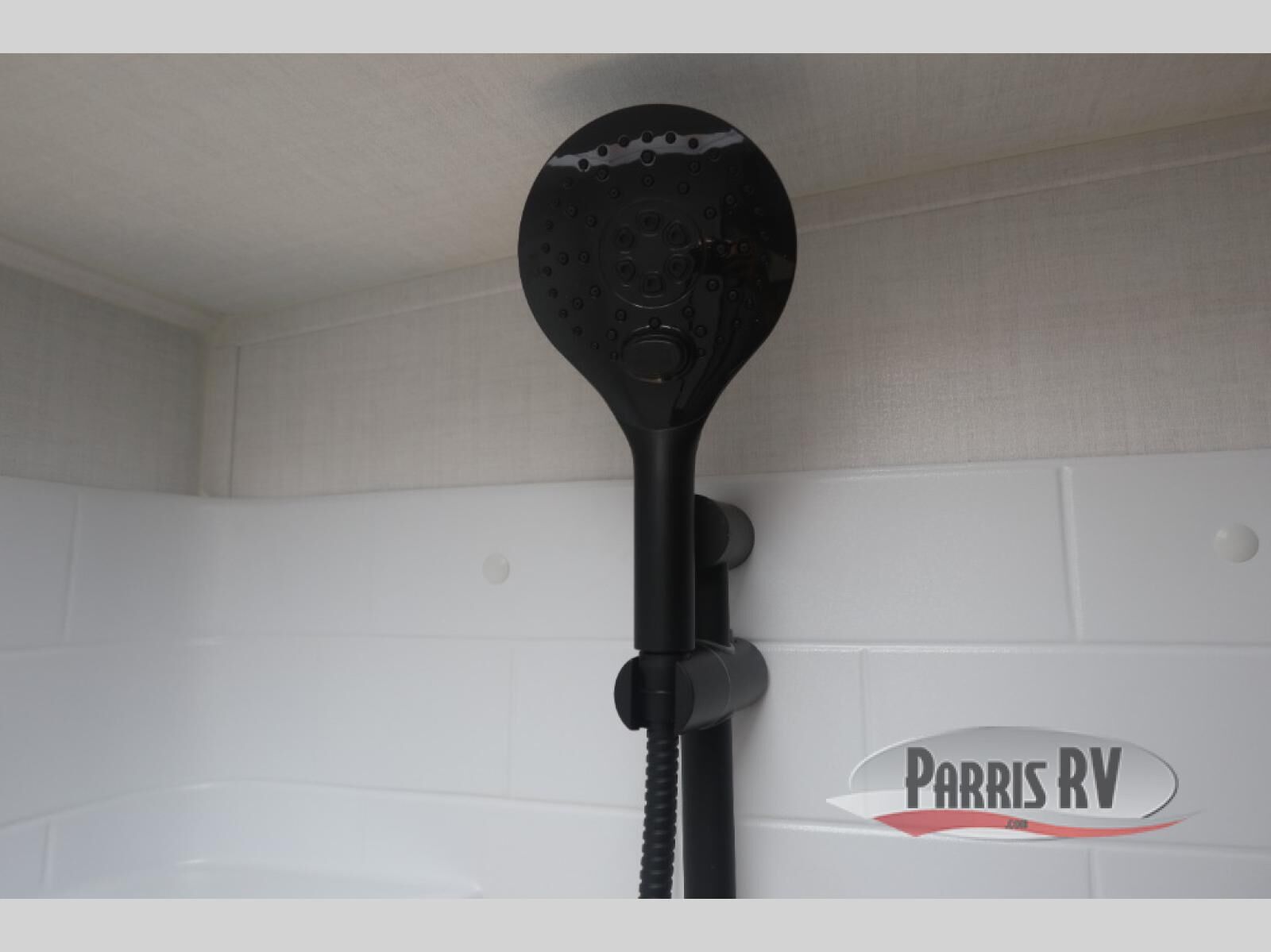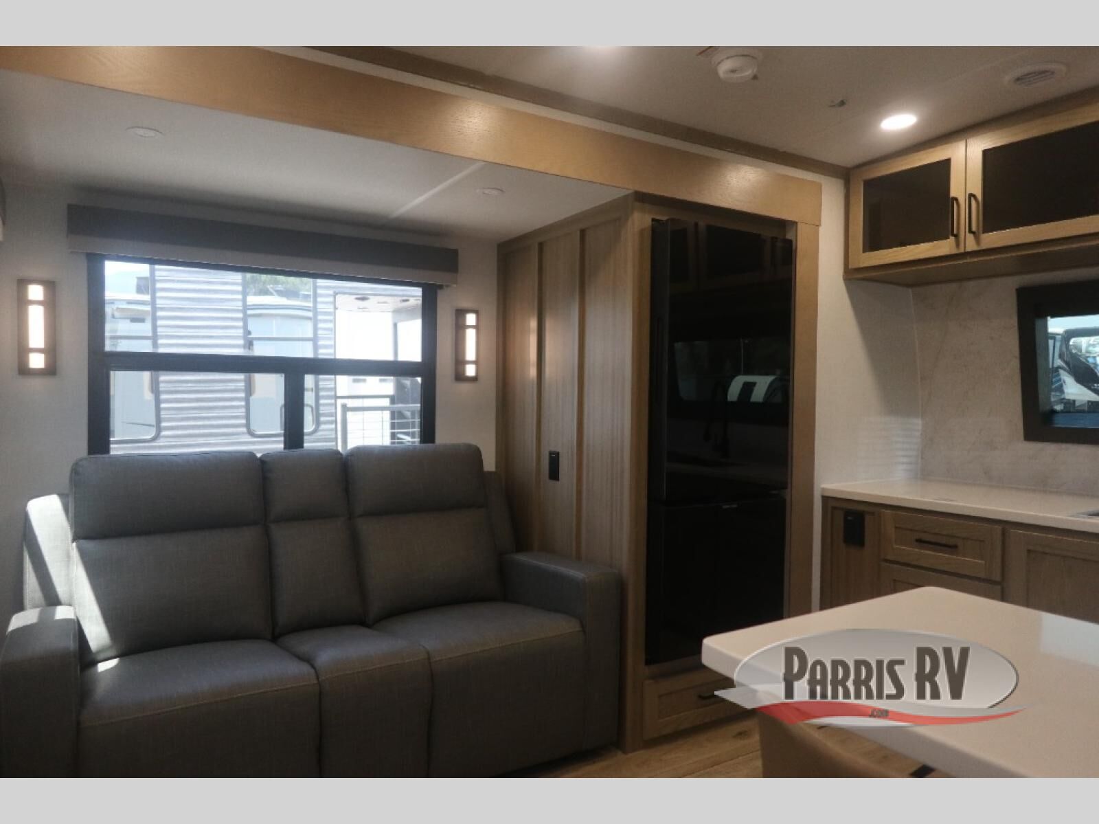 This front kitchen, couple's trailer is ready for adventure when you are! Once you arrive at your destination, prepare a quick lunch on the outside griddle, and enjoy the shade provided by the 19' power awning. You can eat outside, or inside at the counter with stools. The theatre seat will make this travel trailer feel more like home, and the double slides provide more space to stretch out. Within the master bedroom you'll find a king bed, a large wardrobe and a dresser, plus an optional TV. And check out the full rear bath with dual bath sinks and a shower with a seat! Now, that's what I call comfort!