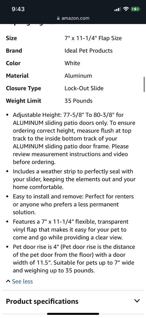 Ideal Pet Products Aluminum Pet Patio Door, Adjustable Height 77-5/8 to 80-3/8, 7 x 11-1/4 Flap Size,