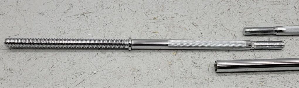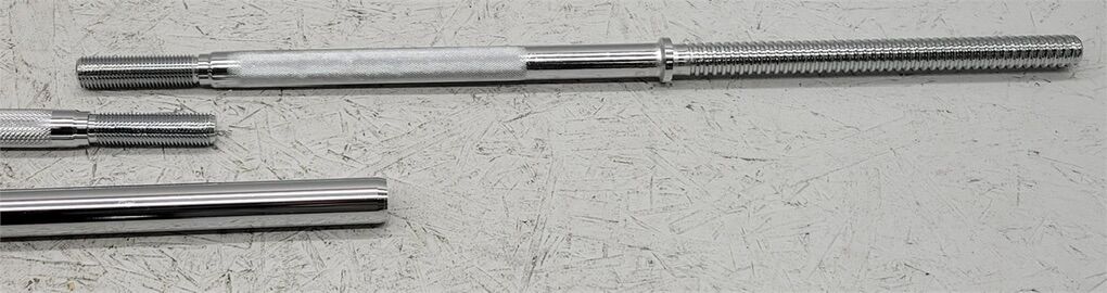 This listing features a 5-foot dumbbell bar, designed in three pieces for easy transport and storage. The bar is constructed from durable chrome, providing a sleek and polished finish. Each section is threaded for secure attachment, ensuring stability during workouts. The knurled grip offers enhanced control and comfort while lifting. Ideal for home gyms or fitness enthusiasts looking to expand their weight training equipment.