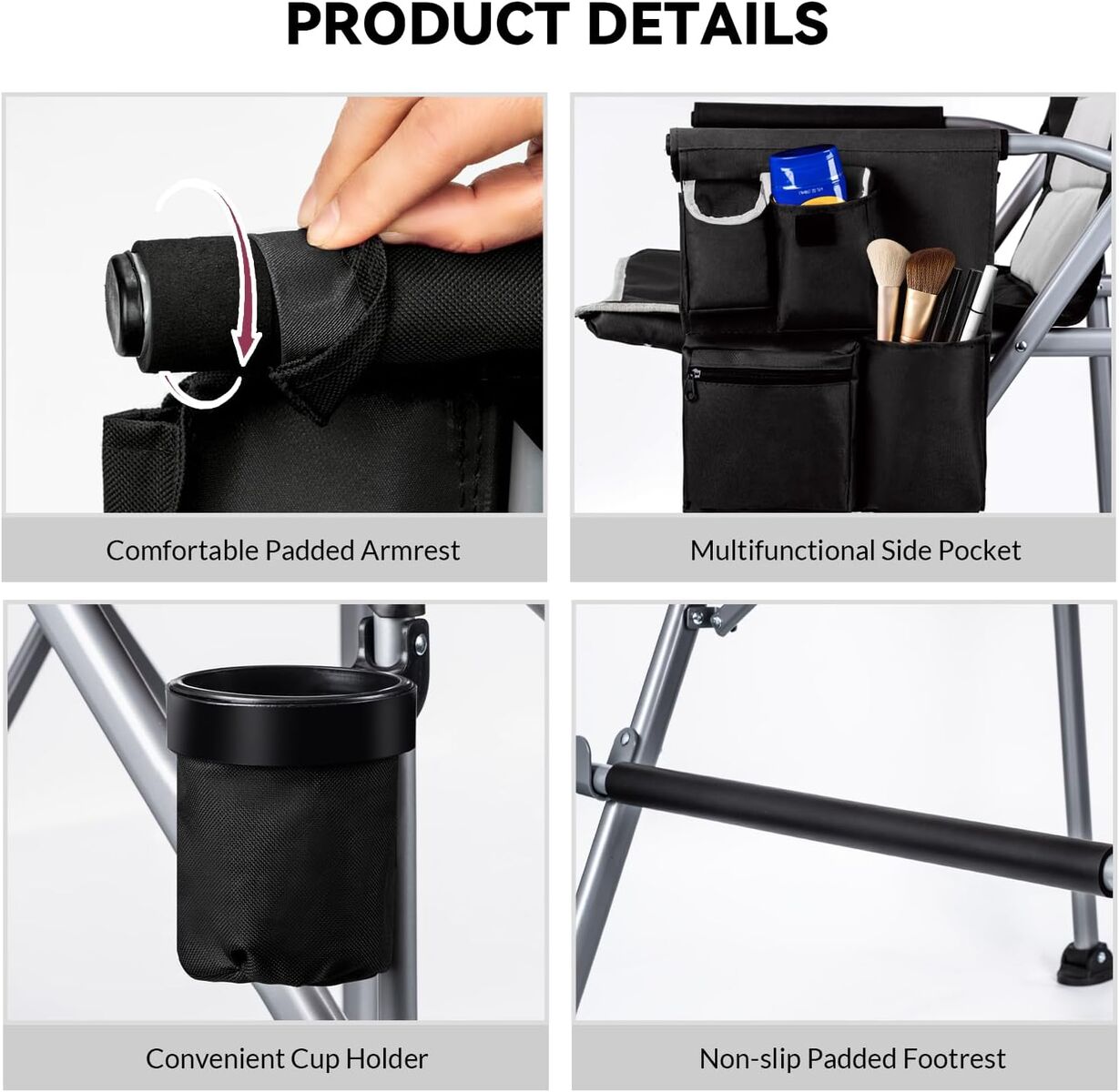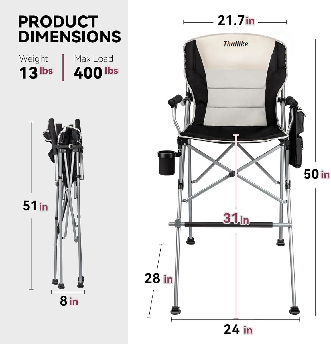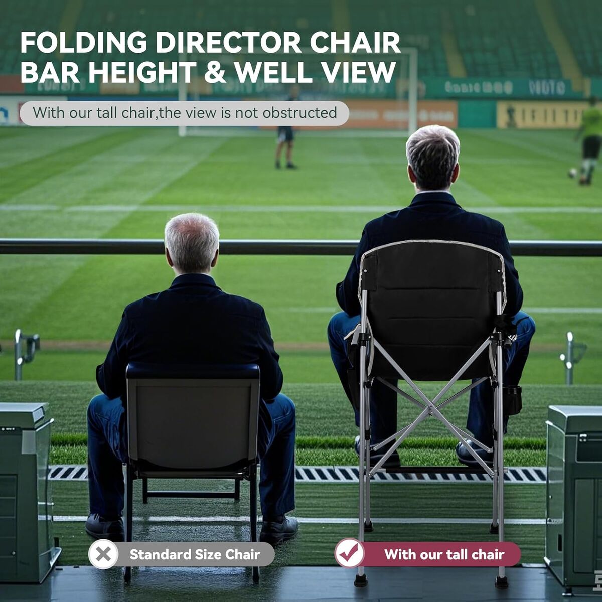 Wider View and Knee-Friendly: Our tall foldable directors chair for adults has a total height of 50 inches, made of thickened heavy-duty steel pipe and 600D Oxford cloth, which can support up to 400 pounds, is tall enough, has a wide field of view,