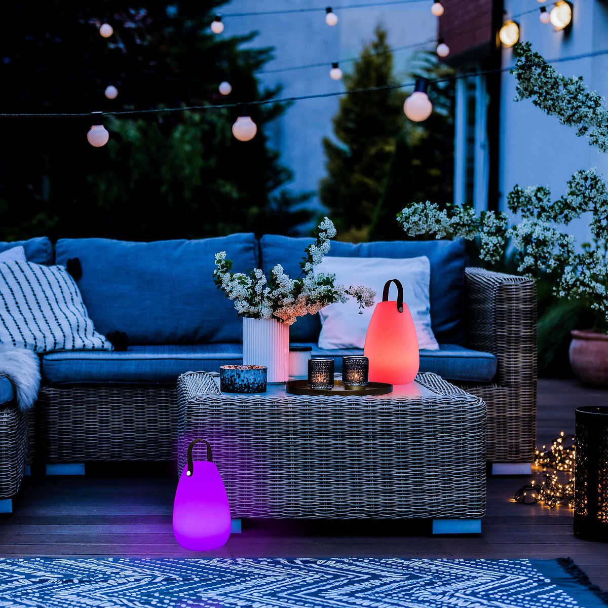 Brighten up your patio or deck atmosphere with a GloGlobe® Rechargeable LED Lantern Set by Seville Classics. Enjoy up to 12 hours of single-color operation on a single charge. These versatile LED Lanterns include 7 LED Colors, 1 multi-color mode and 3 brightness levels of warm white light. Lightweight and portable, these wireless lanterns can be taken anywhere.