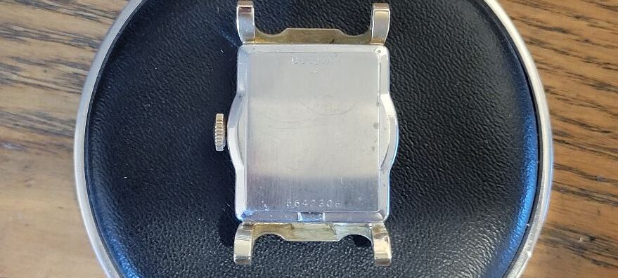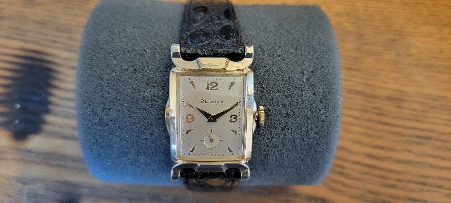 I’m selling a used vintage BULOVA wristwatch in a yellow gold-filled case and stainless-steel case back. The watch has been serviced and timed. The watch model name is the Delegate. The watch dial is silver in color. The watch case has some wear. The watch has a 21-jewel movement. The watch is circa 1953.