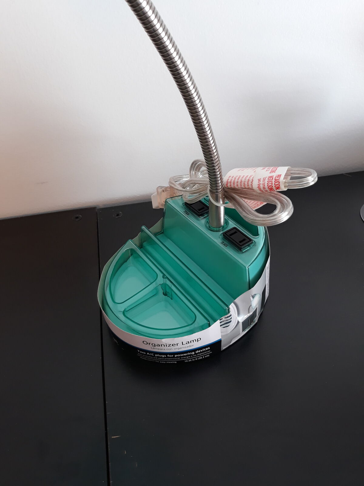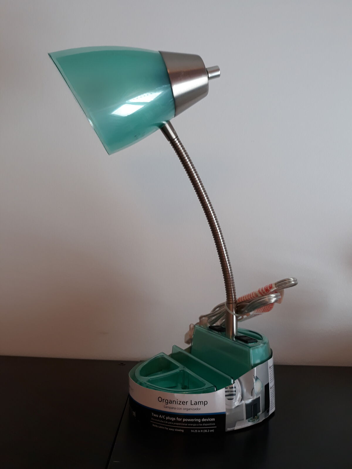 This is a cute organizer lamp by mainstay. It has two AC plugs for powering devices. It can hold a tablet for easy viewing. It would be great on a desk or a bedside table. It is 14 and 1/4 in high. It is new. I have two of these. They are a great buy at $7 each or two for $10. Cash only. Phone calls or texts please. thanks for looking!