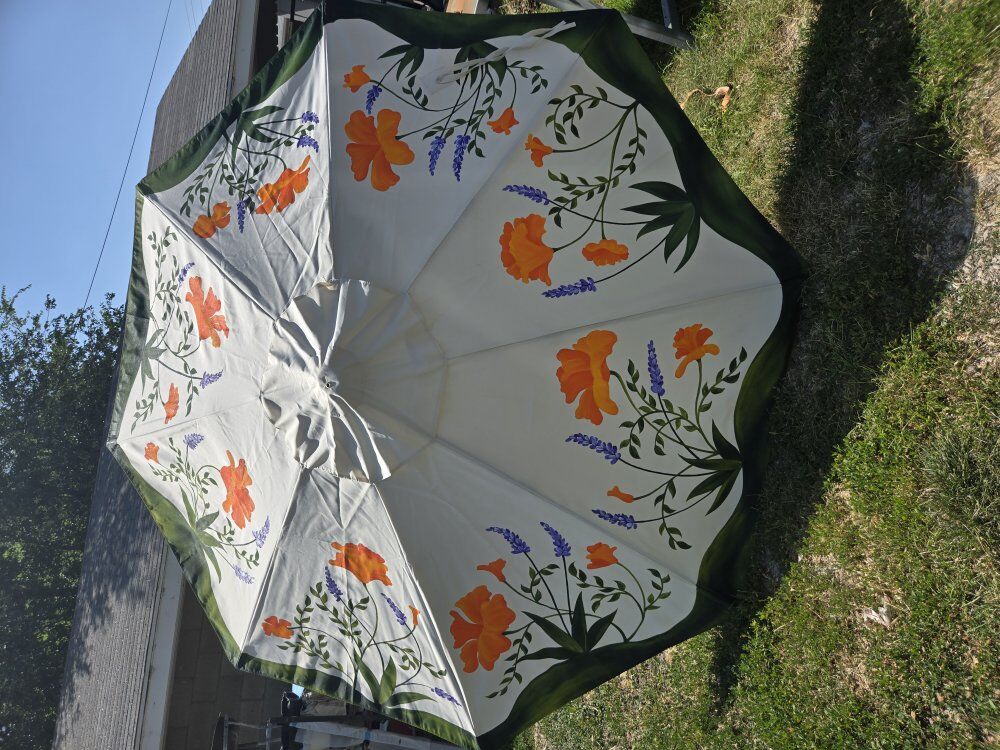Hand painted custom garden art unbrella- California Golden Poppies & Lupins. New still in box 9' umbrella really nice. No base included.