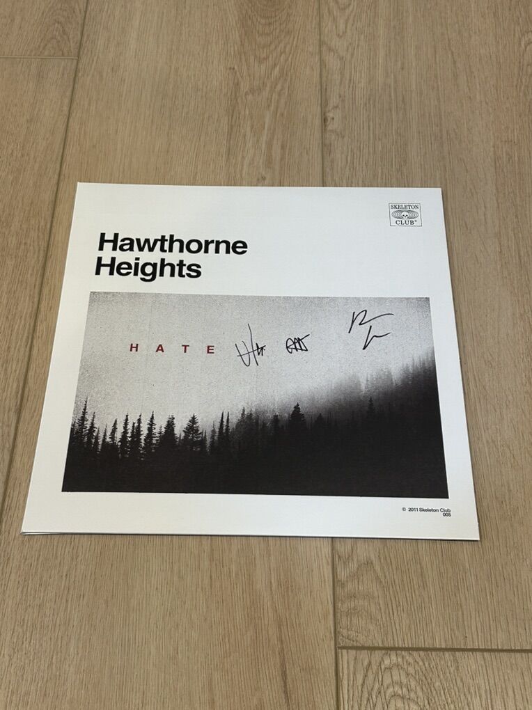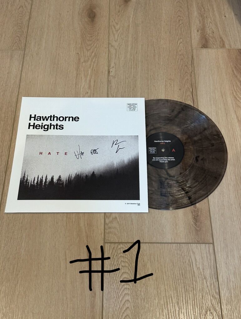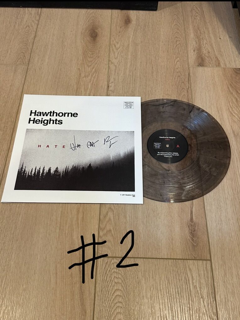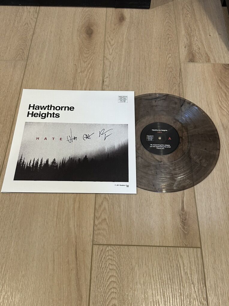 Manhattan Fog 12 Hate Vinyl Variant (Clear w/ Gray Swirl)-Only 300 Pressed in this variant making it rare & great for any collector. Signed on the cover X3. Plus a Hawthorne Heights Sticker of your choice so let me know which 1 you want, the options are in the last picture. I took pics of both vinyl on the record player so you could see the color of the vinyl better because it was on a white slip mat, but they are brand new & have never been played.