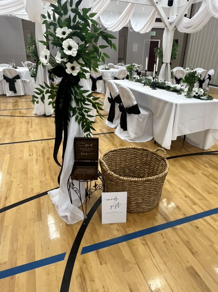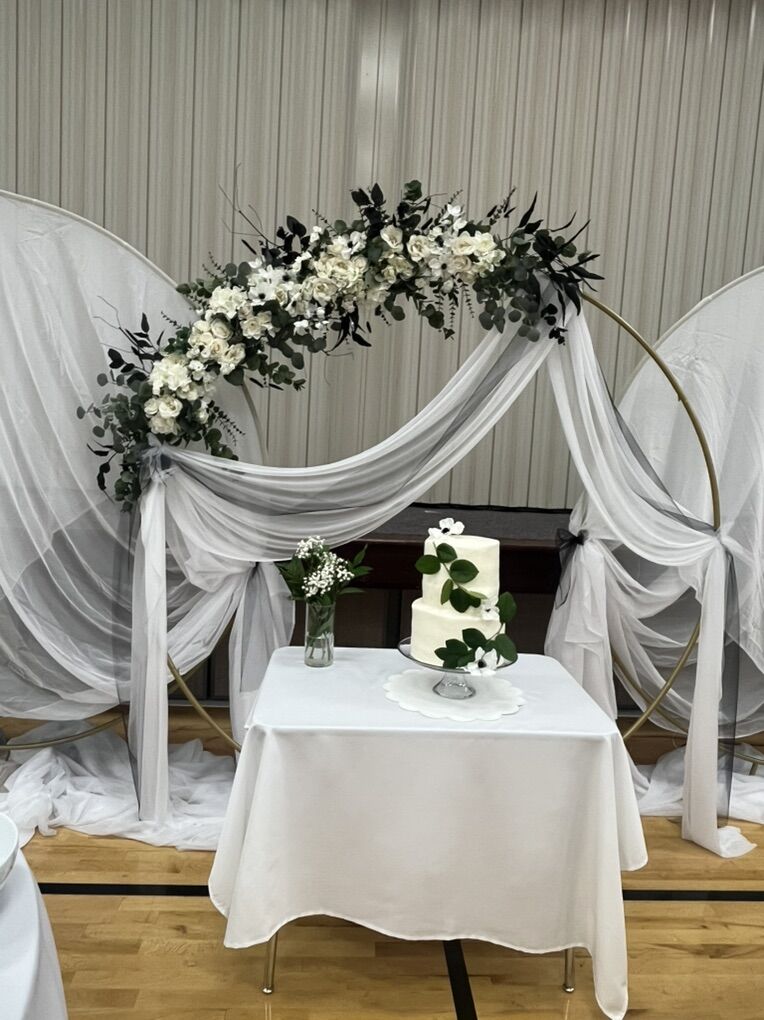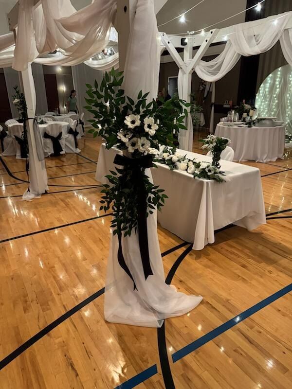 Table clothes Chair covers Ceiling drapery/ large wood centerpiece Round arches Ceiling lights