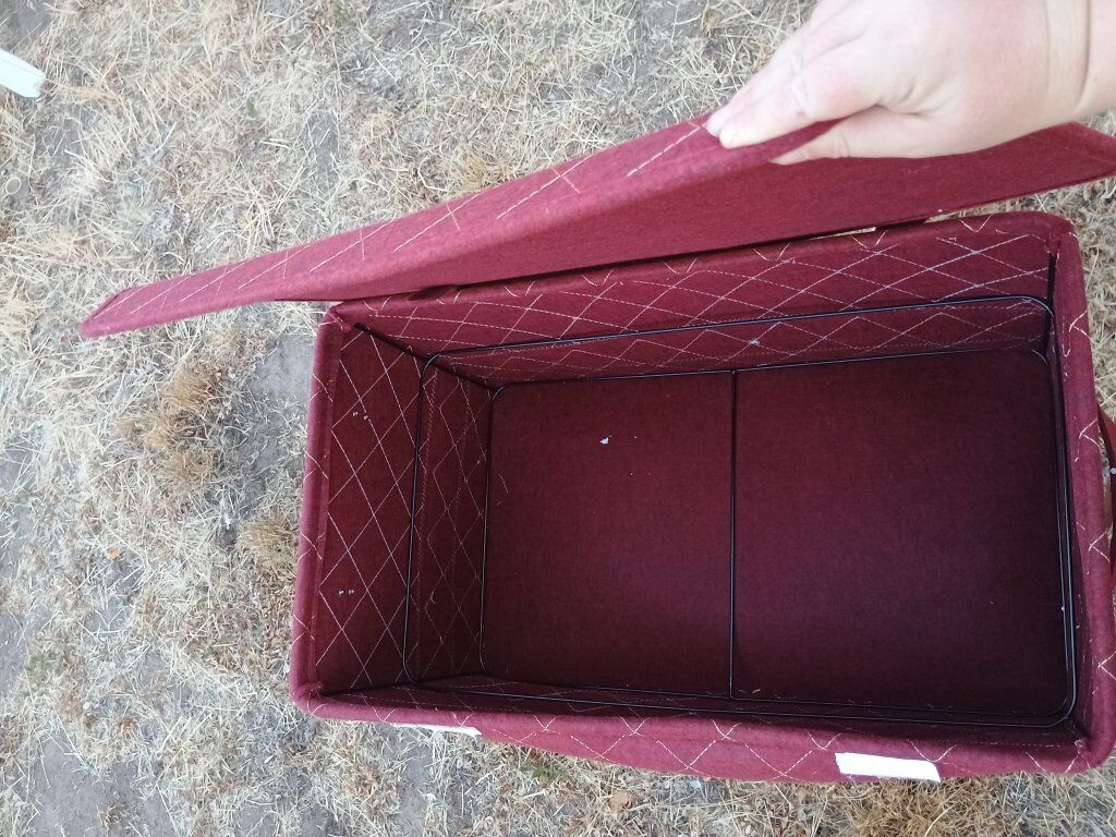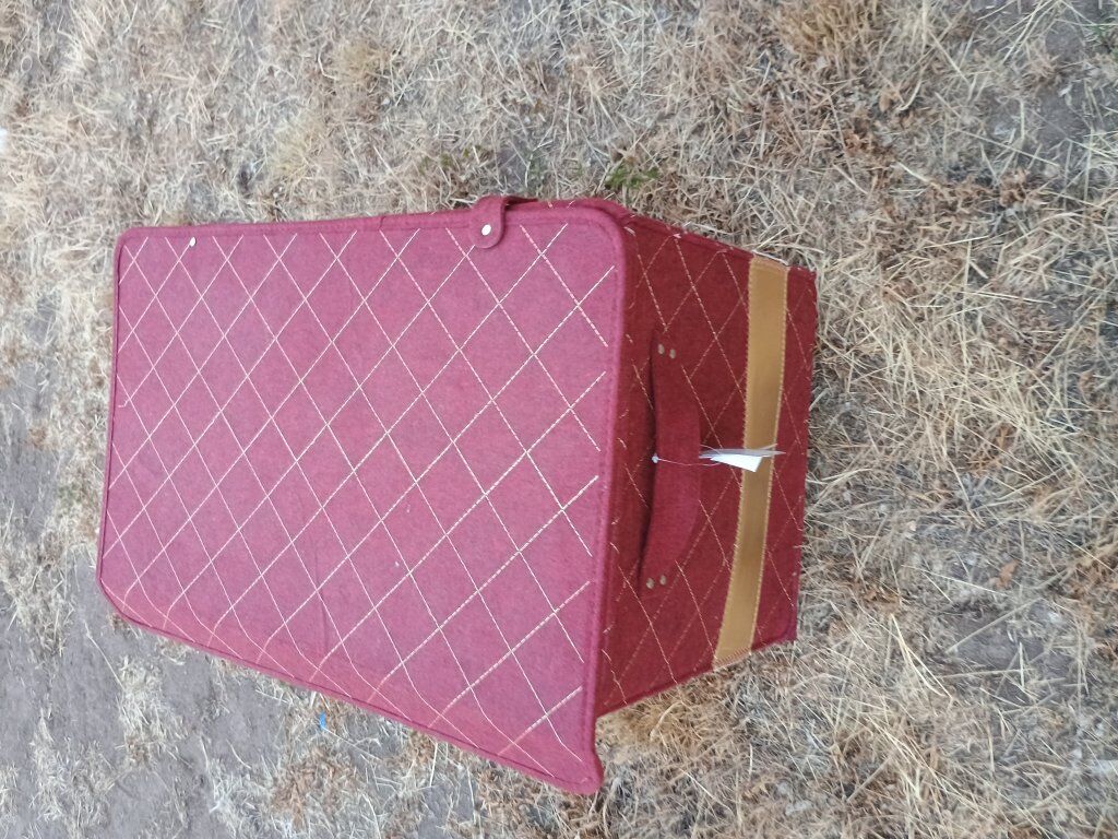 cute red and gold fabric storage box. great for storing extra blankets, accent pillows, towels, holiday decorations and more. approx 12in tall and 26 by 15in