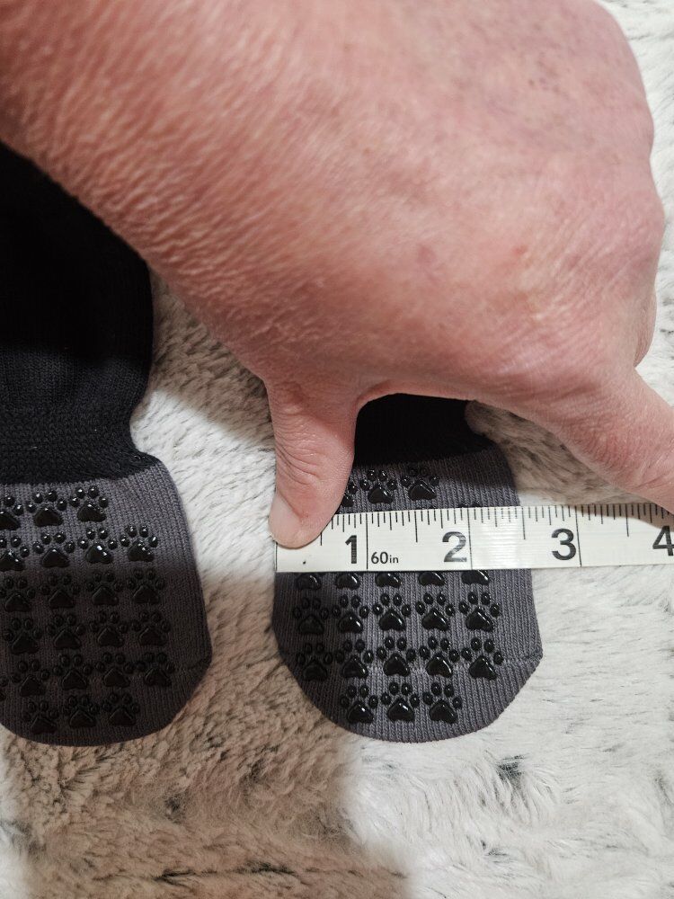 This set of dog socks are new never used. They are size medium. They are 75% cotton, 25% Polyester. The velco does snap on or off if your little one doesn't need it. The paw print grips are on both sides of the socks. All my items come from a smoke free home. Any questions please feel free to contact me.