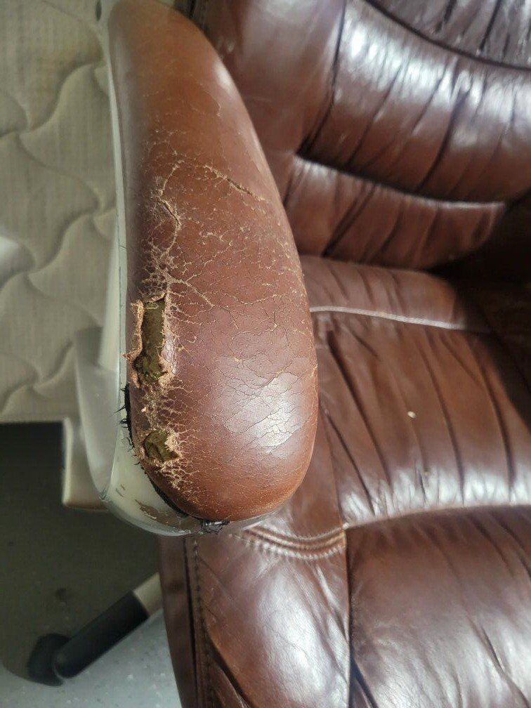 VenmoSuper comfy, well loved office chair. Other than the arm rests needing some TLC, (see photos) this chair is awesome and has a lot of life left!! Lift and lower the seat to provide maximum hight comfort, swivel, rock and roll to where ever you need to move. If you like comfort while working and don't mind a little project, this is the office chair for you!! It is a Deep reddish brown leather.