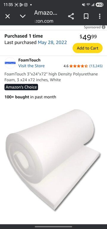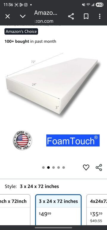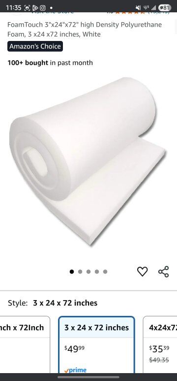 High density foam cushion 3x24x72 inches. I bought this new on Amazon 3 years ago and abandoned the project. See photos. cash only. first come first serve. no delivery.