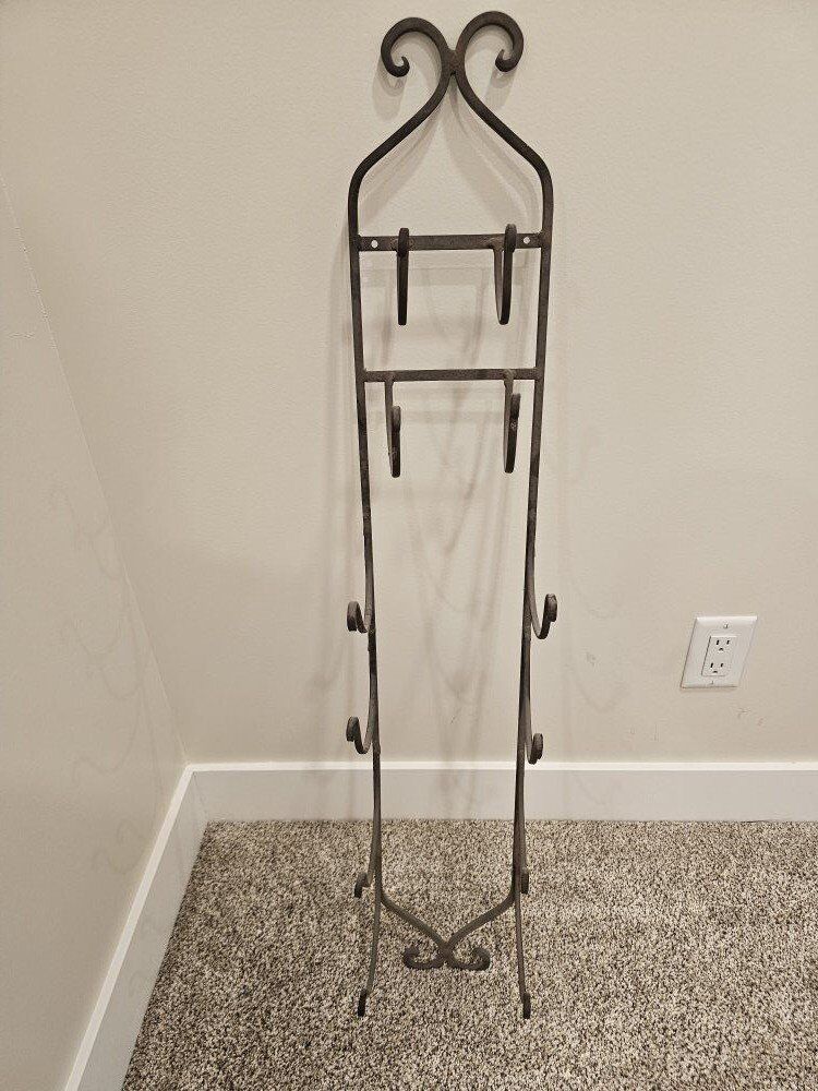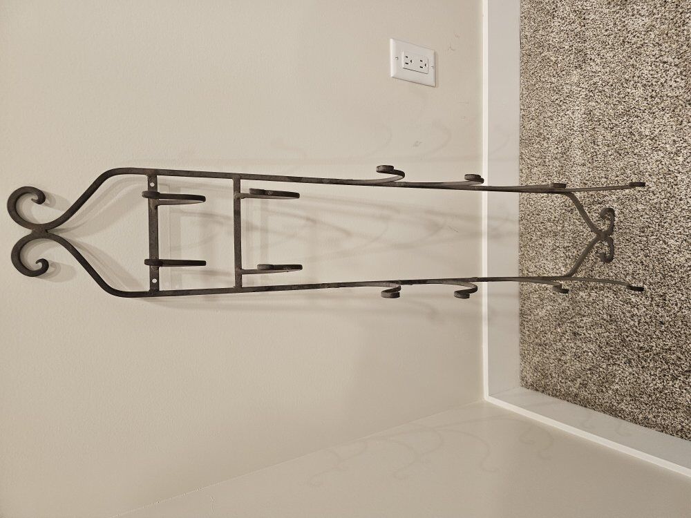 Wall hanging iron bath towel holder, holds 4 bath towels and 2 hand towels rolled up.