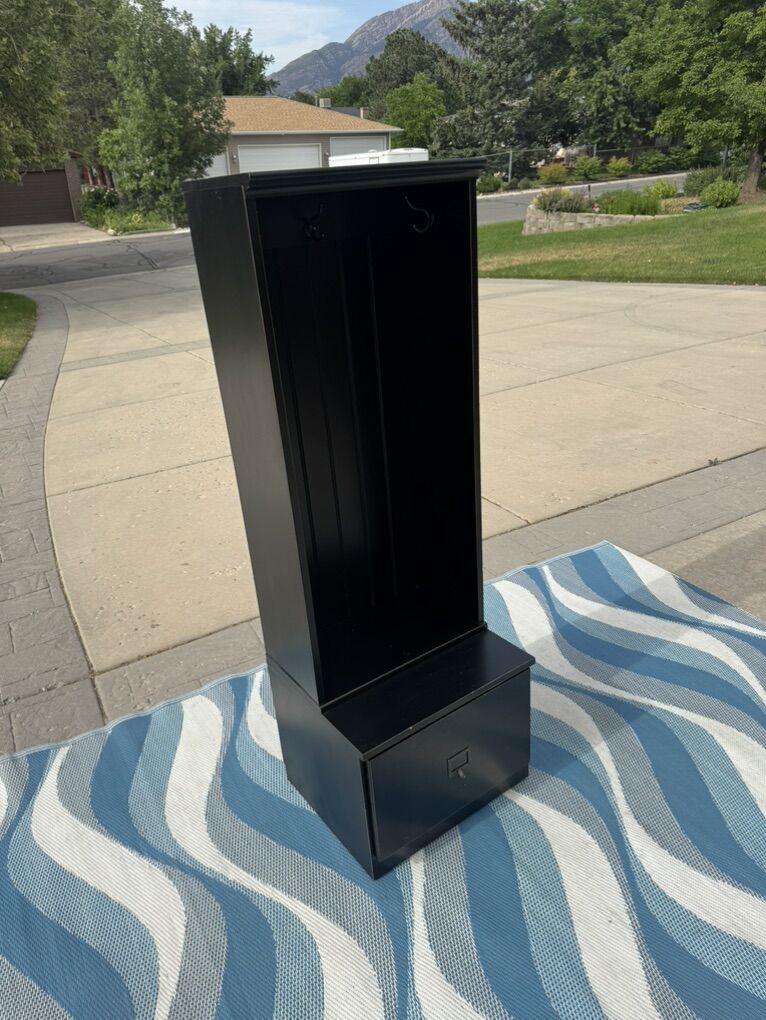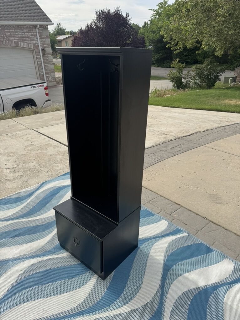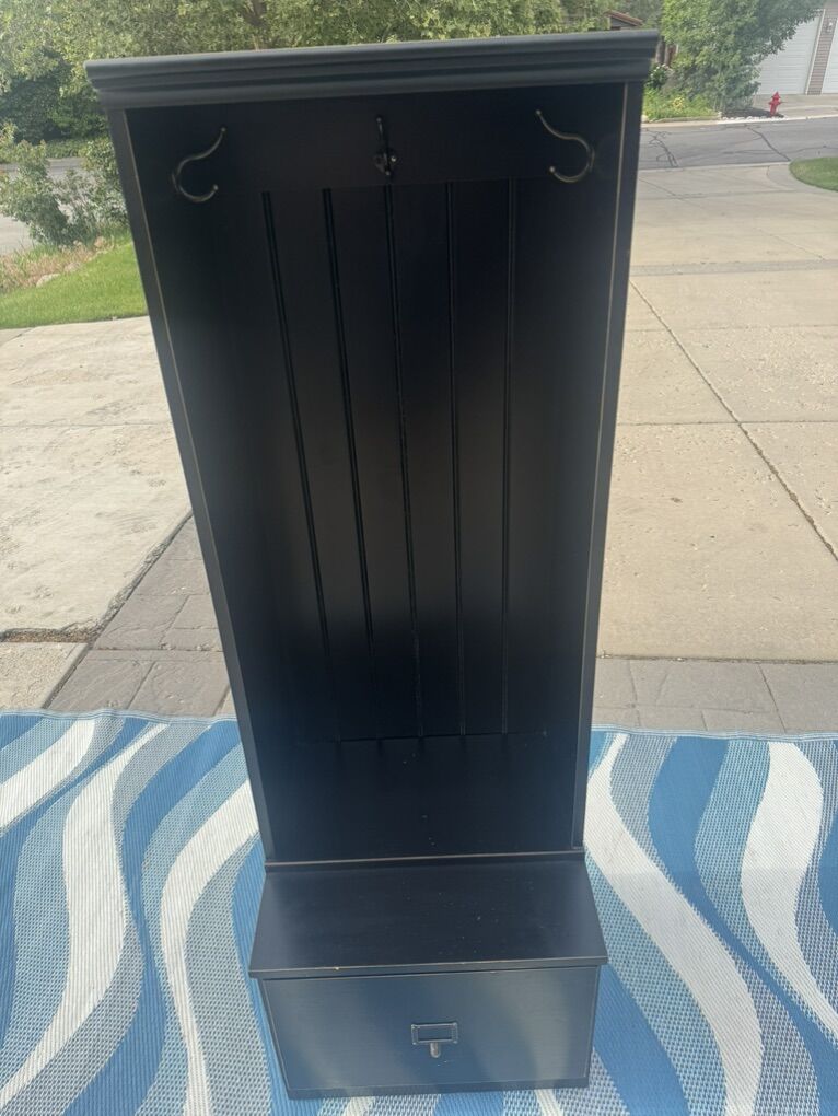 Great for keeping by door where you first walk into home. Has 3 hooks to hang coats/jackets, a sitting nook, and storage drawer.