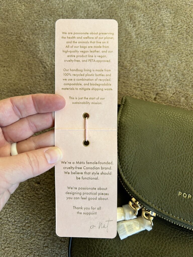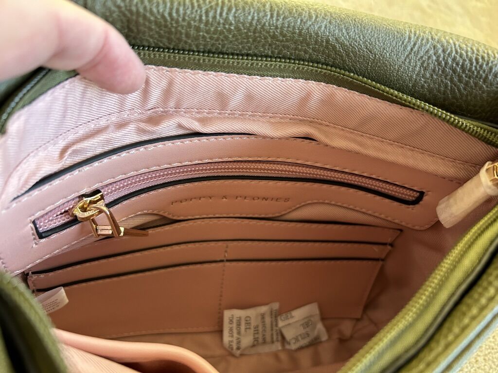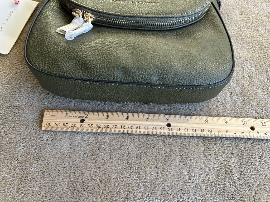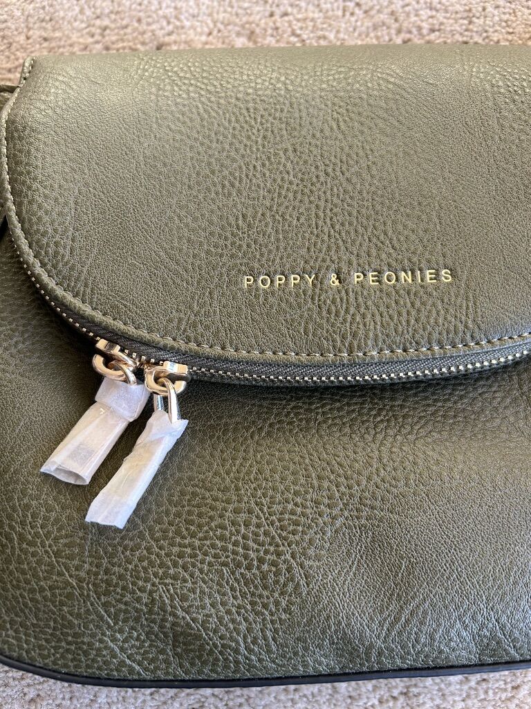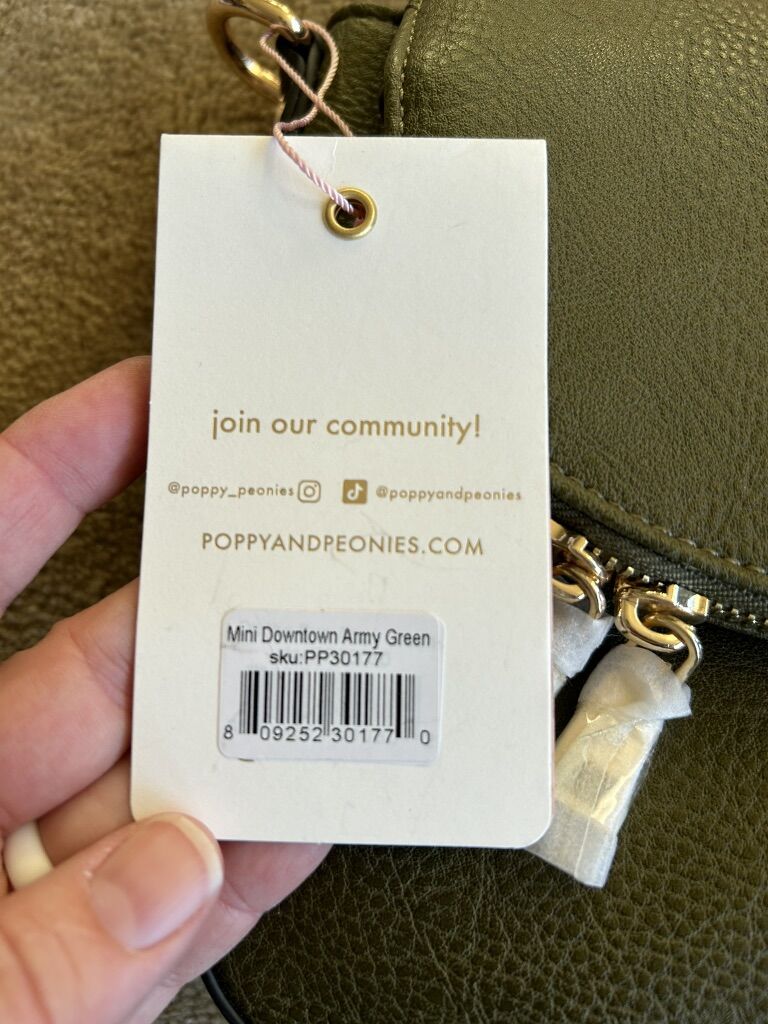 NEW Poppy & Peonies Mini Downtown Purse in army green. Front zipper pocket, back slide pocket, adjustable crossbody strap, soft pebbled vegan leather, gold hardware. 9.5” x 9” x 2”. Beautiful, high-quality bag. New, unused condition (new with tags, components wrapped in tissue paper). Text only. Cash or Venmo.