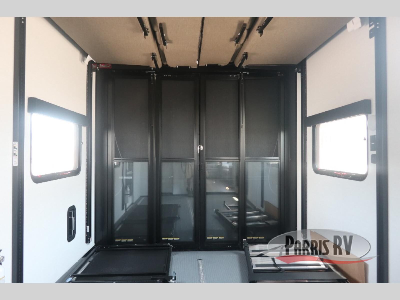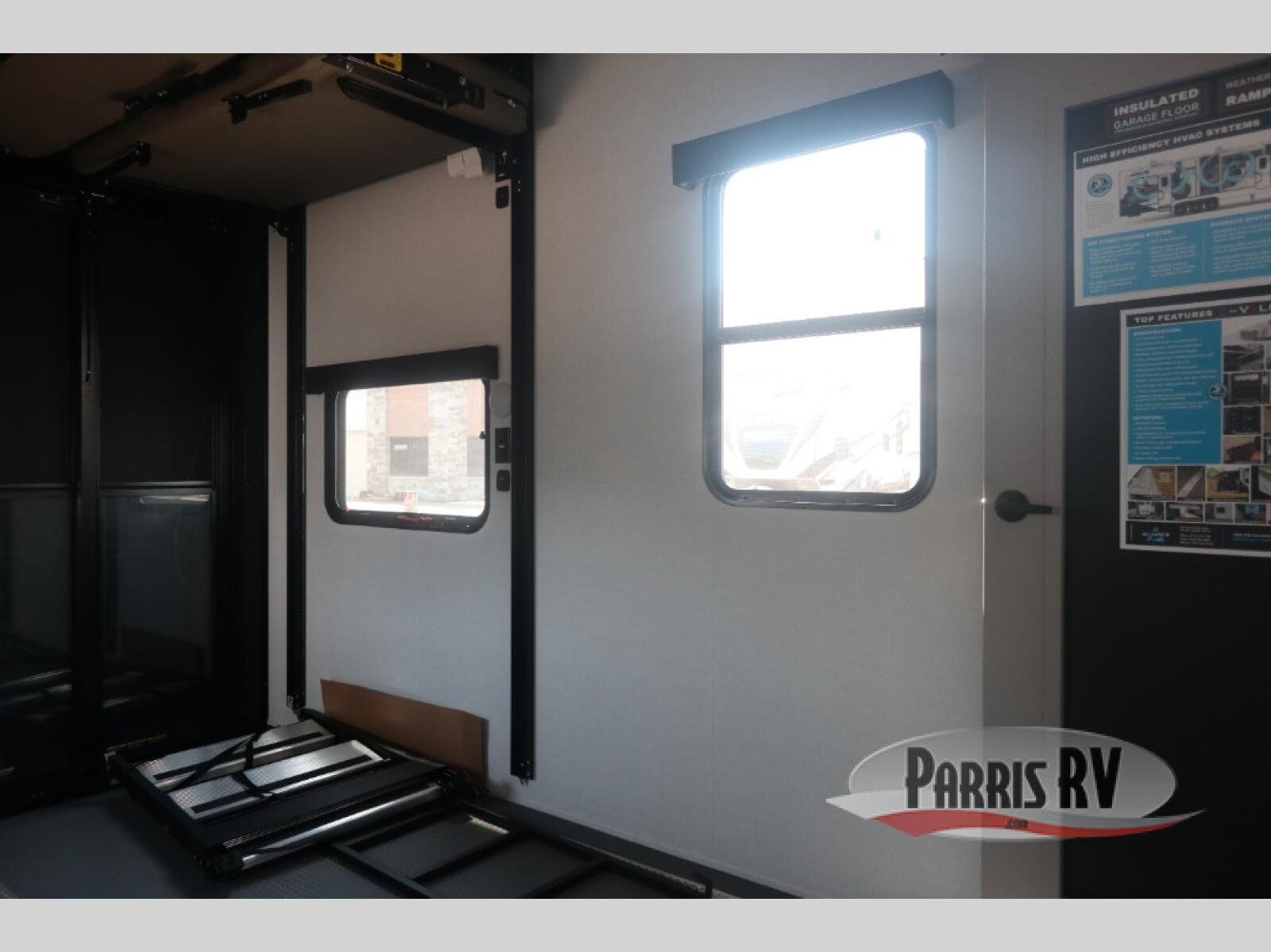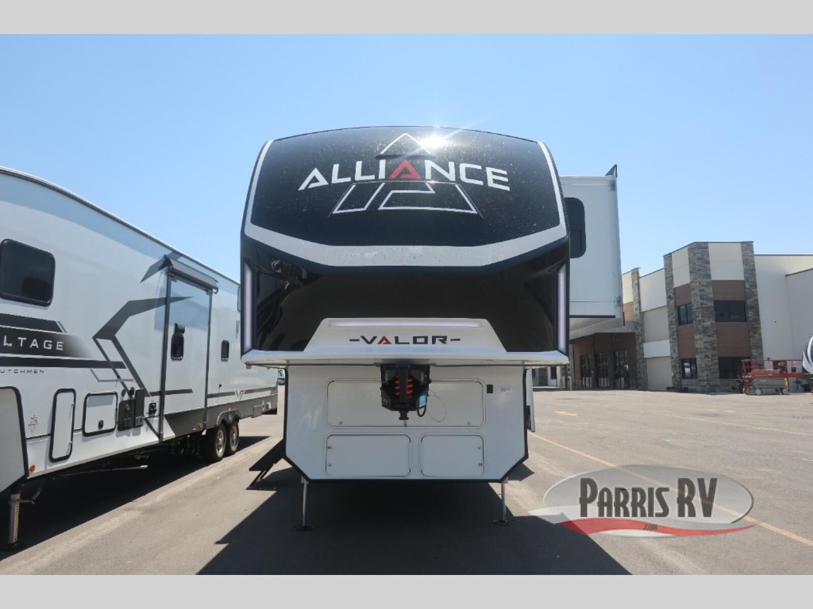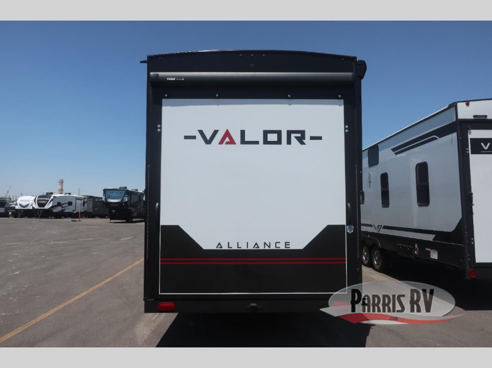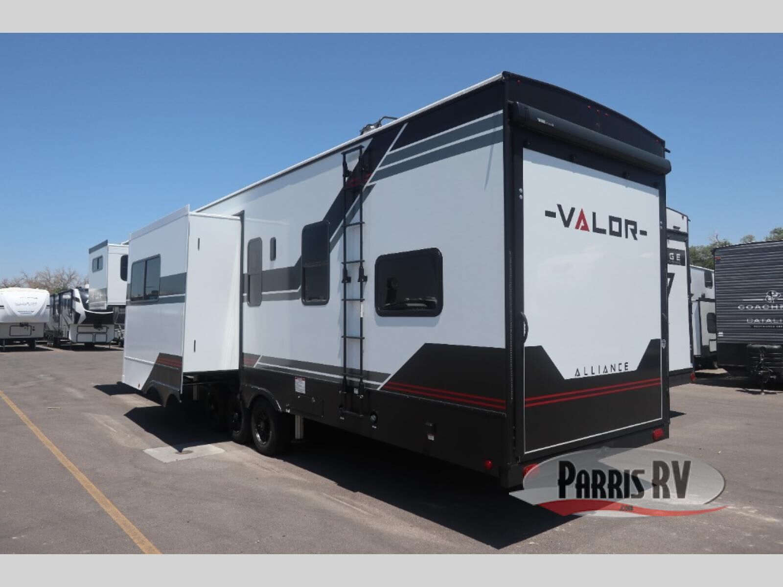 You can bring your toys with you wherever you go with any one of these Alliance RV Valor toy hauler fifth wheels! They are adventure-ready with a quality build from the walk on roof with seamless PVC roof covering to the commercial grade vinyl flooring and MorRyde CRE3000 suspension system. The Performance Running Gear package comes with a 101" wide-body benchmark chassis platform, 7,000 lb. Dexter axles, and a space enhancing drop frame storage compartment to pack in all your riding gear. You can even go off-gridding thanks to the Off the Grid Pack that has two 400 watt solar panels, generator prep, a 40 amp charge controller, and a 100 amp hour lithium iron phosphate battery. Some of the interior comforts you will enjoy are the hardwood cabinet doors and drawers, solid surface kitchen countertops, and commercial grade vinyl flooring with no carpet to make clean up a breeze. The Valor toy haulers are also the Masters of 12 Volt with USB charging station throughout, a stainless steel refrigerator, and more 12 volt features to make camping hassle-free!