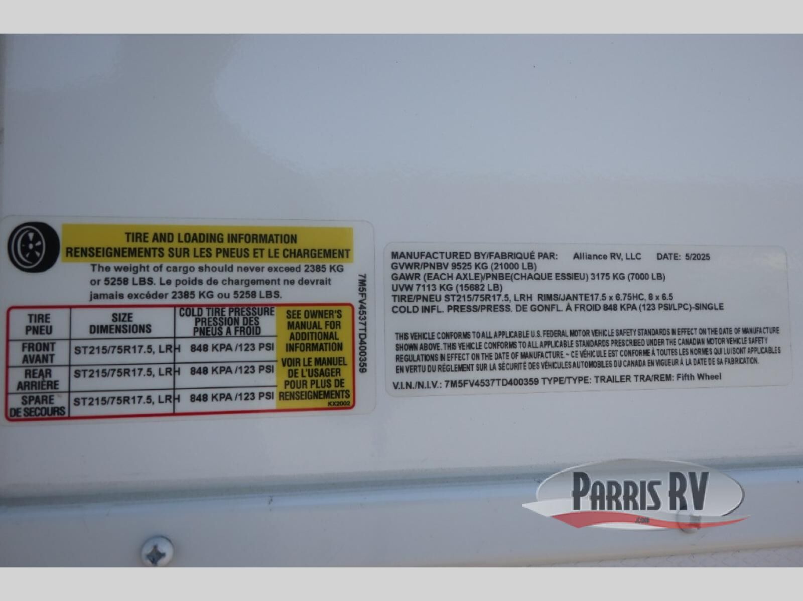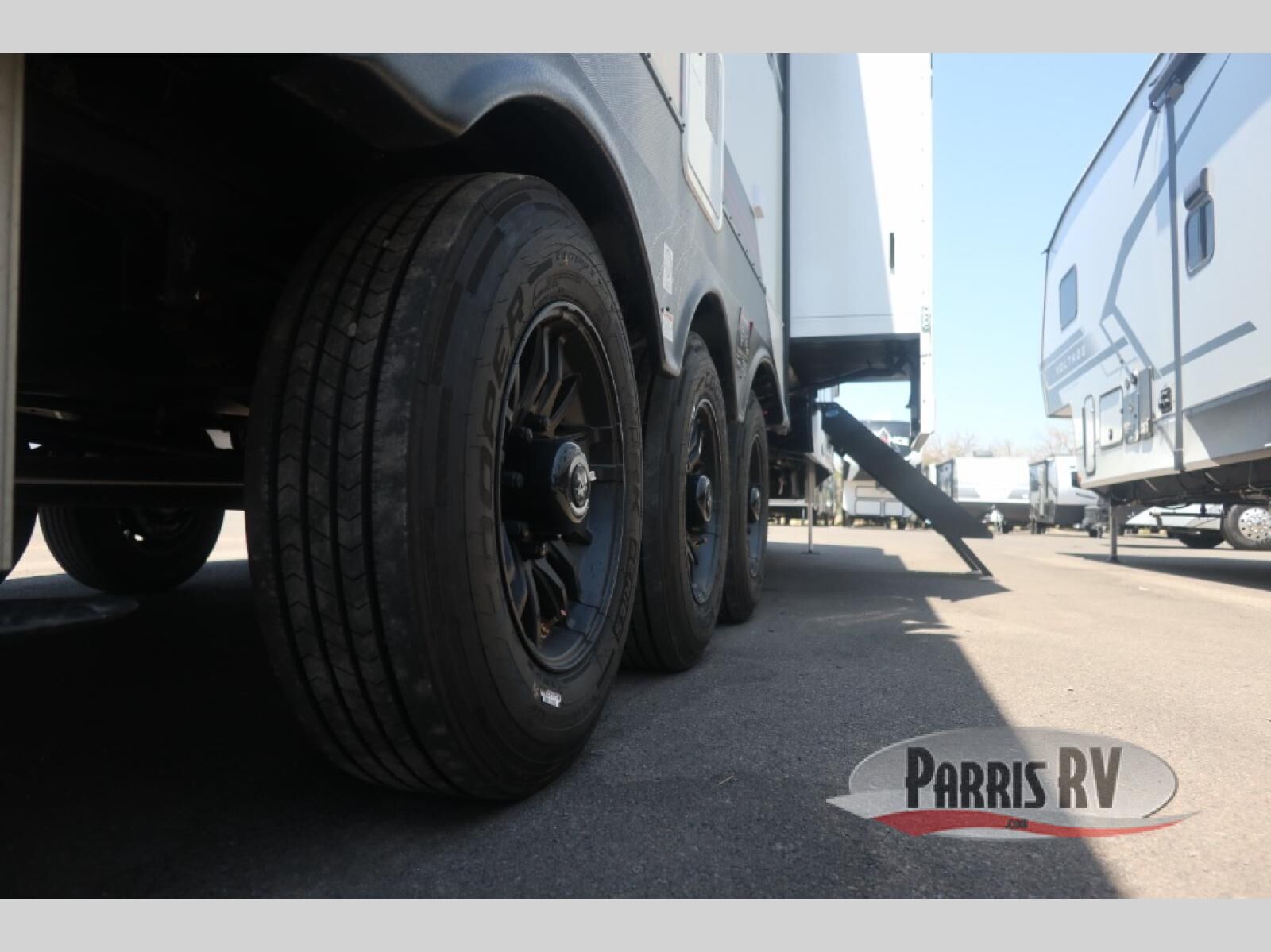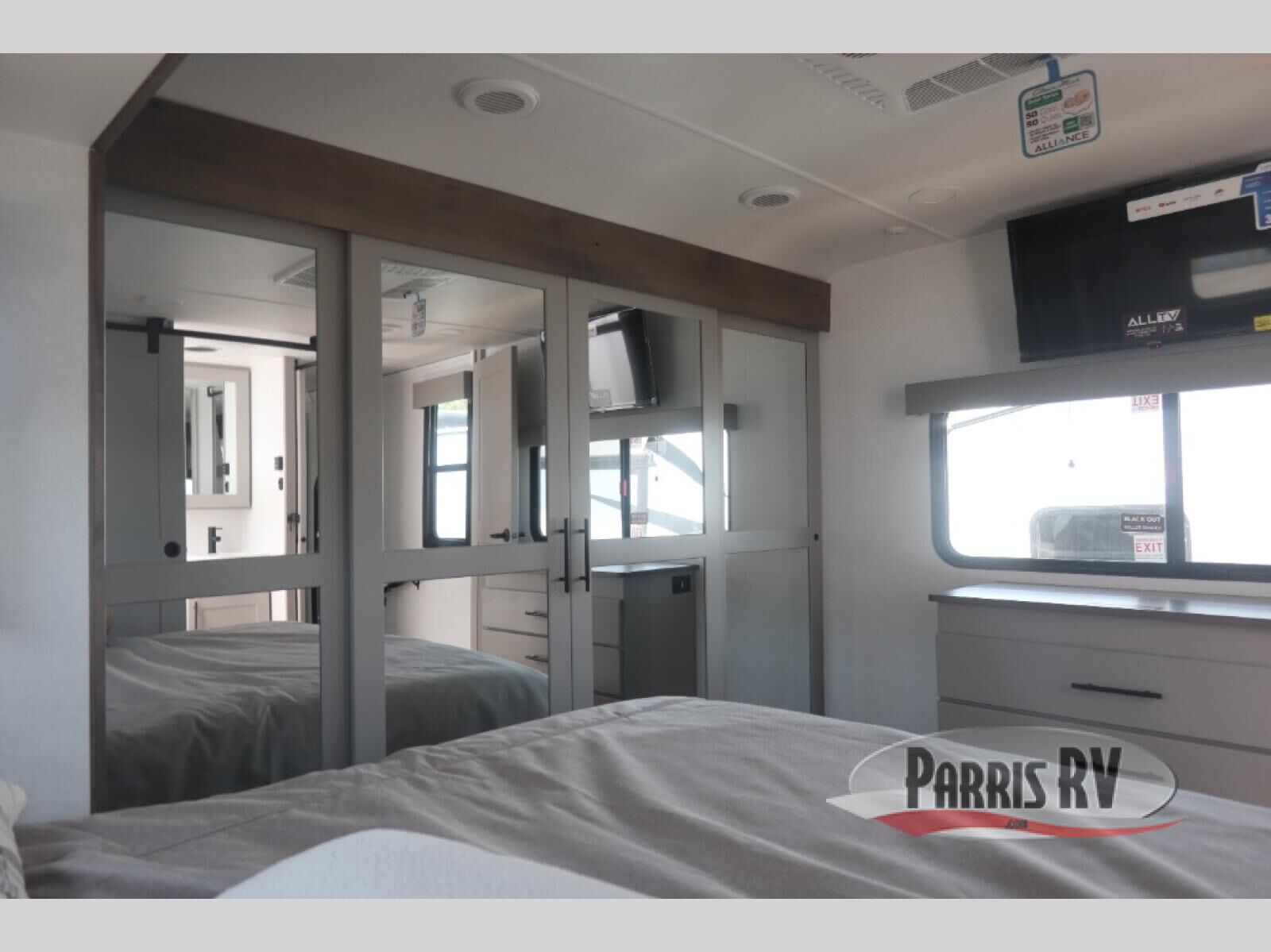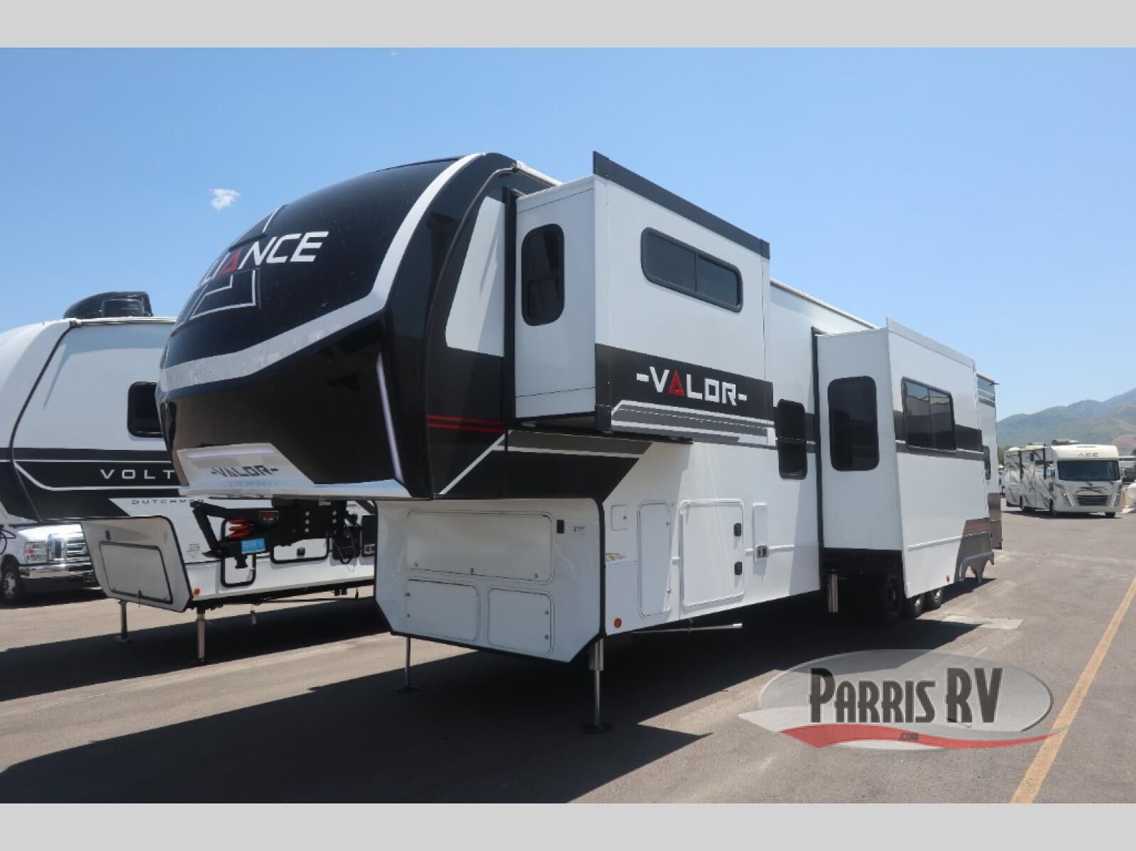 You can bring your toys with you wherever you go with any one of these Alliance RV Valor toy hauler fifth wheels! They are adventure-ready with a quality build from the walk on roof with seamless PVC roof covering to the commercial grade vinyl flooring and MorRyde CRE3000 suspension system. The Performance Running Gear package comes with a 101" wide-body benchmark chassis platform, 7,000 lb. Dexter axles, and a space enhancing drop frame storage compartment to pack in all your riding gear. You can even go off-gridding thanks to the Off the Grid Pack that has two 400 watt solar panels, generator prep, a 40 amp charge controller, and a 100 amp hour lithium iron phosphate battery. Some of the interior comforts you will enjoy are the hardwood cabinet doors and drawers, solid surface kitchen countertops, and commercial grade vinyl flooring with no carpet to make clean up a breeze. The Valor toy haulers are also the Masters of 12 Volt with USB charging station throughout, a stainless steel refrigerator, and more 12 volt features to make camping hassle-free!