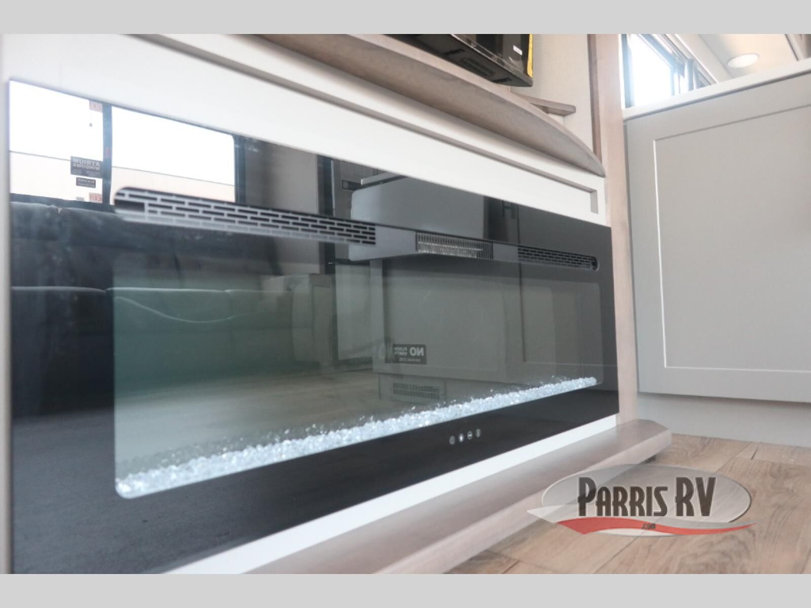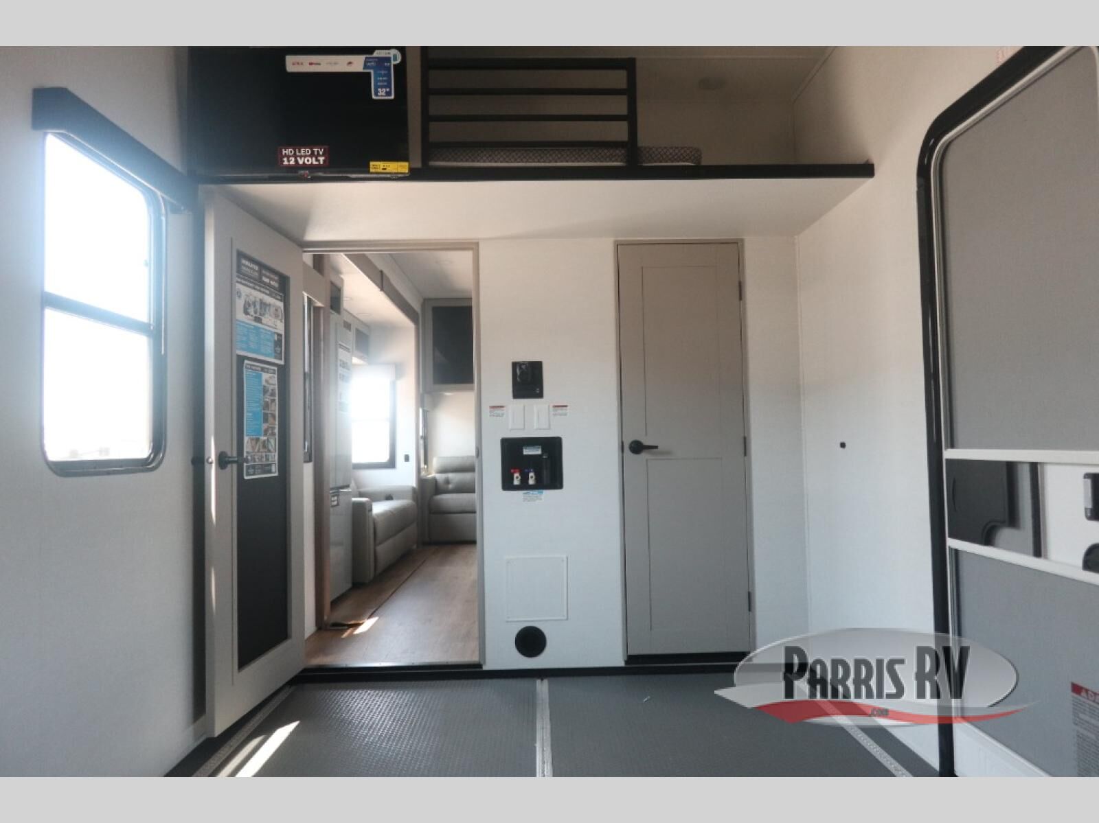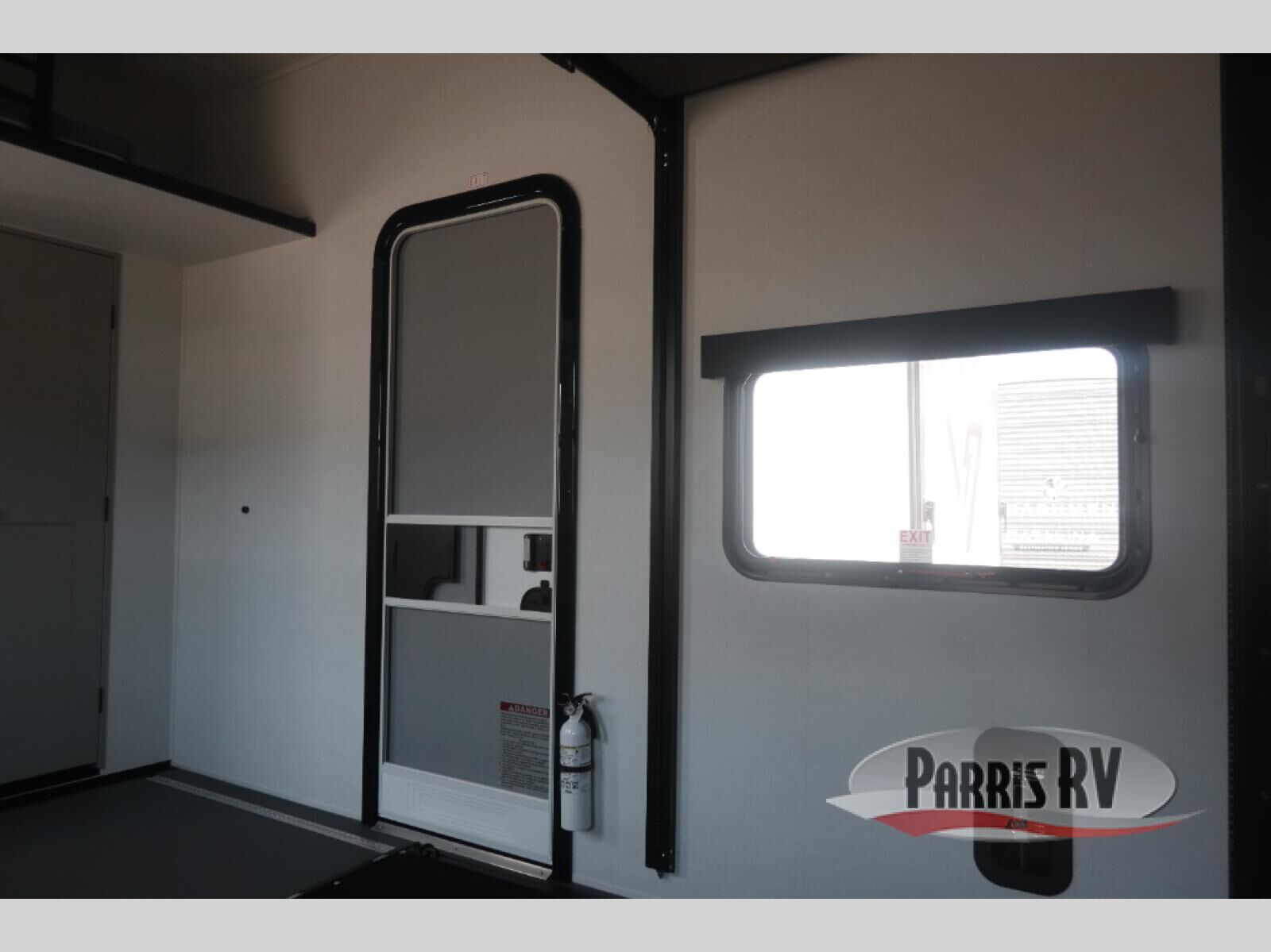 There is room for your off-road toys and the whole family in this toy hauler! The bath and a half makes life more convenient and the dual entry doors create a smooth flow of traffic in and out of the unit. Aside from 13' of garage space and an entrance/exit door, there are also opposing HappiJac sofas with a queen bed above them, a loft that opens to the garage, and a half bathroom. The chef can prepare their best meals with the four burner cooktop while two others sit at the flip up counter with two bar stools. After a fun day on the trails, wash up in the full bathroom with the 48" x 30" shower, grab your pajamas from the front wardrobe or flip top dresser in the front private bedroom then relax on one of the two sofas by the fireplace and 50" HDTV!