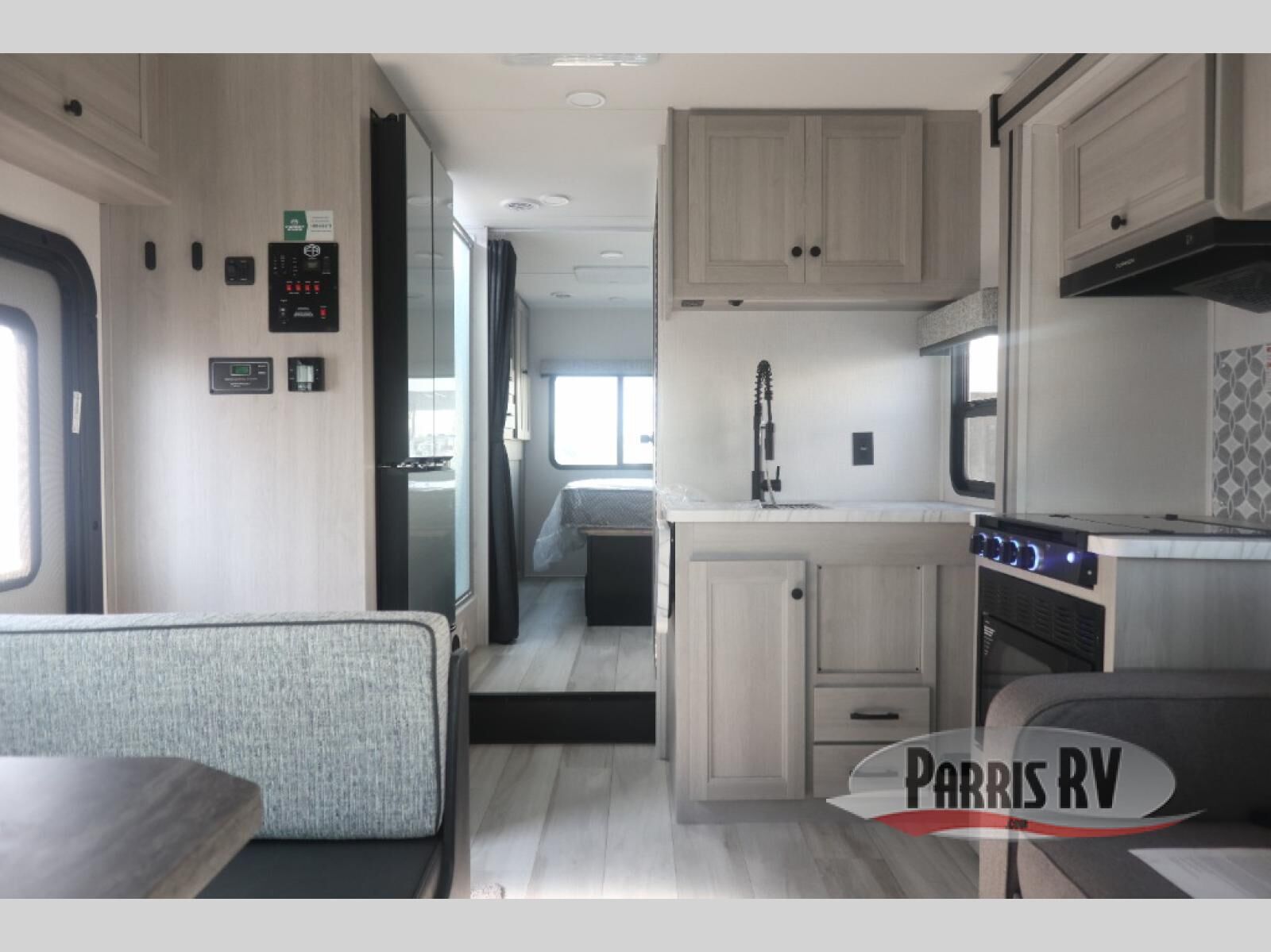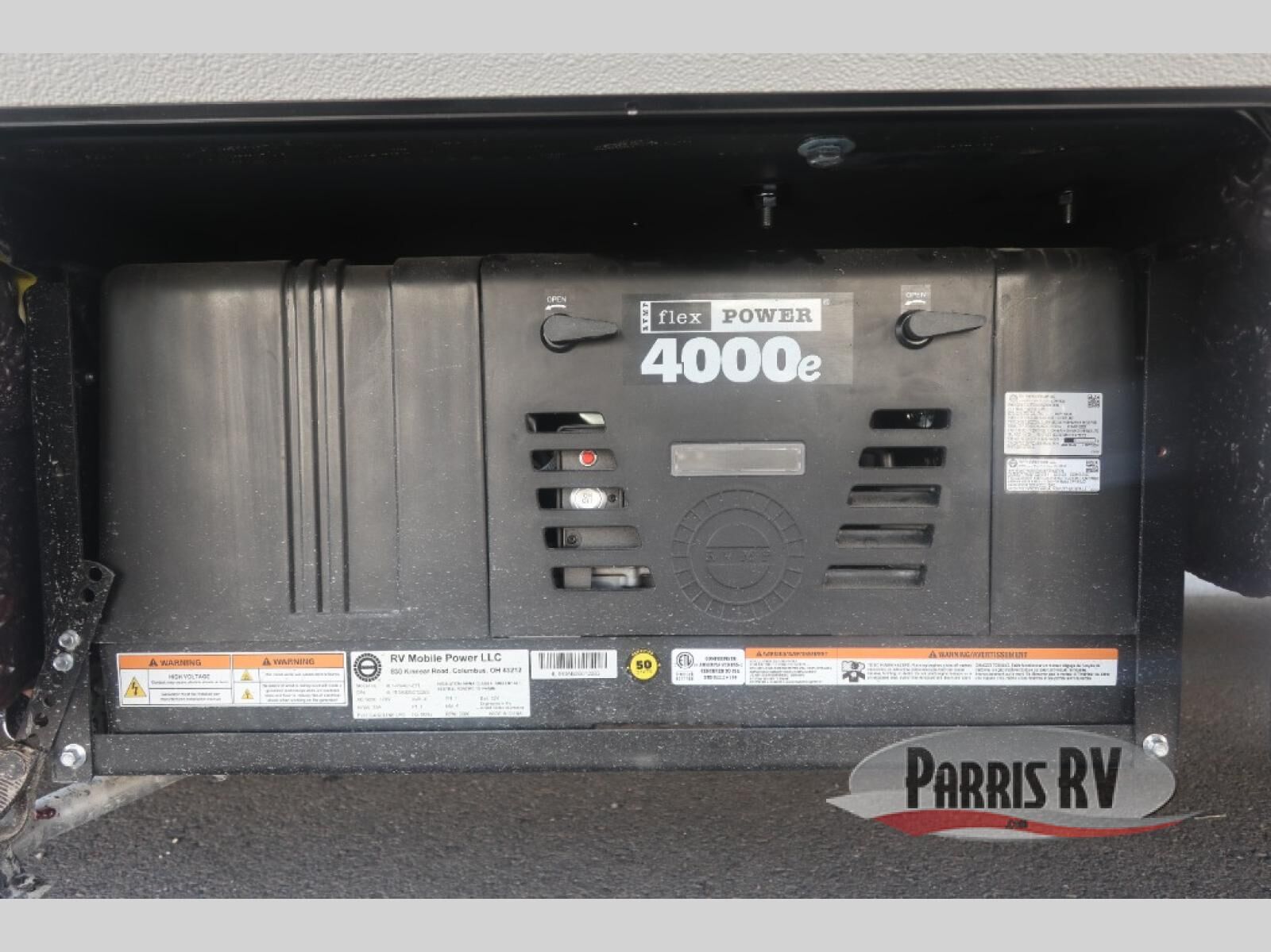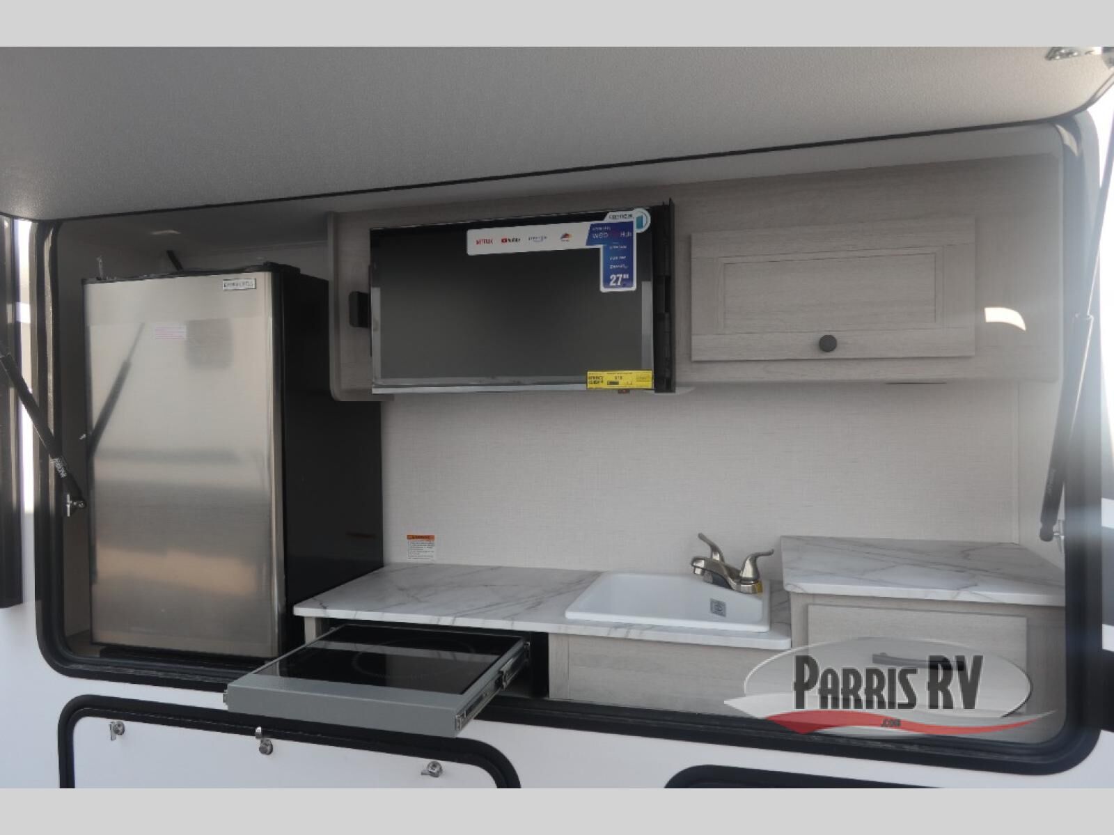 Pack your bags and pick your favorite destination then head out in this motorhome! The rear private bedroom has a 60" x 74" queen bed slide for more interior space, and a linen closet with wardrobes on either side of it. There is also a split-style bath with a private toilet and sink, and the shower is right across the hall. Prepare your best home cooked meals using the three burner cooktop, enjoy dining at the booth dinette, and store any leftovers in the 10.7 cu. ft. 12V refrigerator. You will also appreciate the outside kitchen with a refrigerator and cooktop plus an outside TV to watch the big game. Relax each evening on the sofa slide out, or you can replace it for the optional power theater seating. There is even a 60" x 80" bunk over the cab for extra sleeping or storage space!