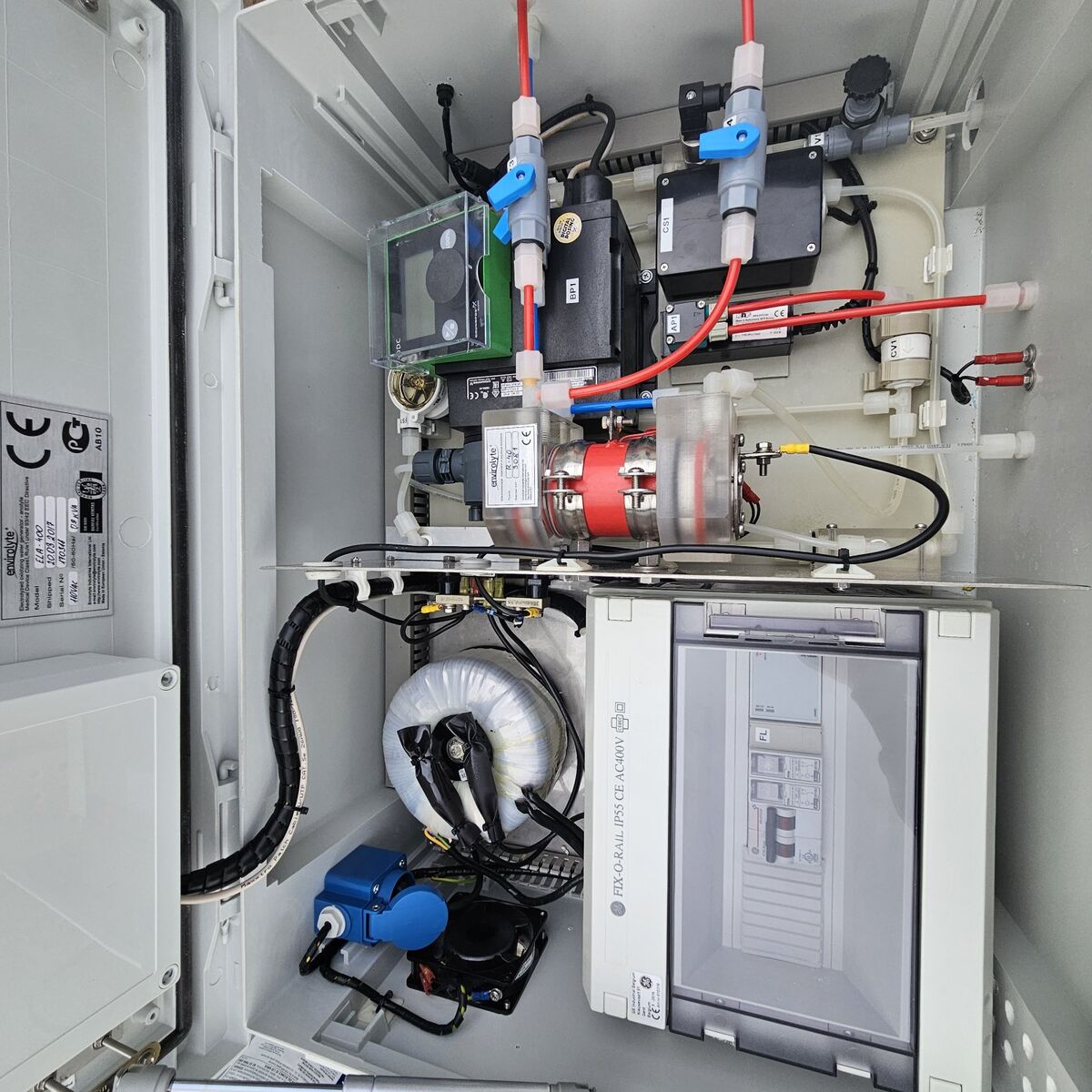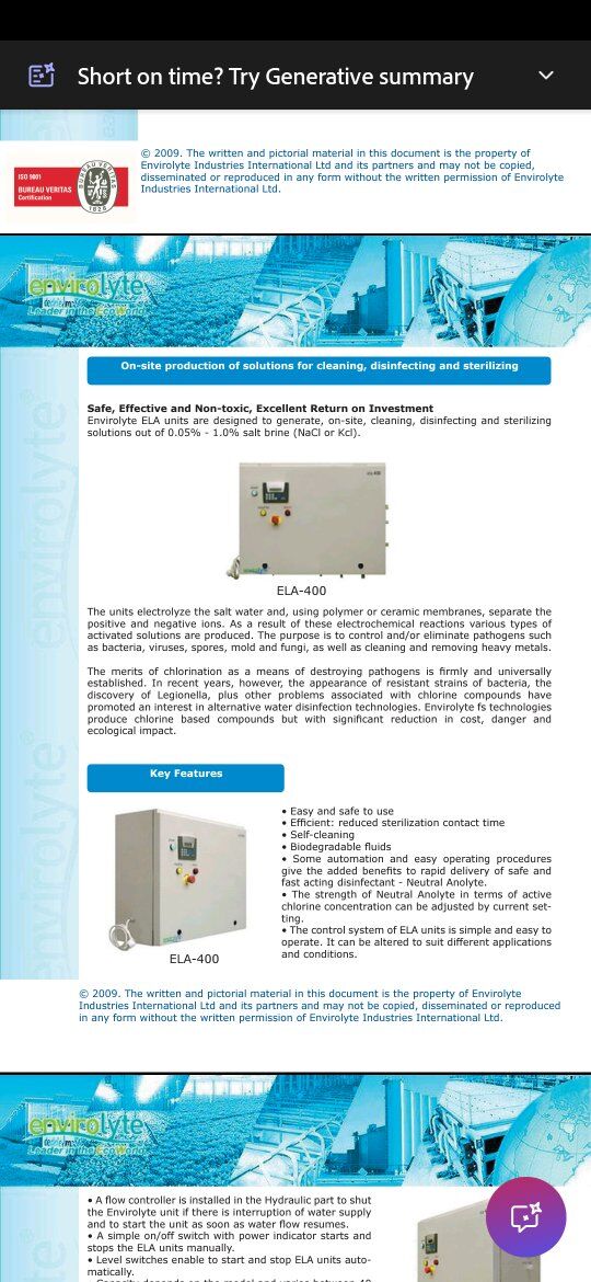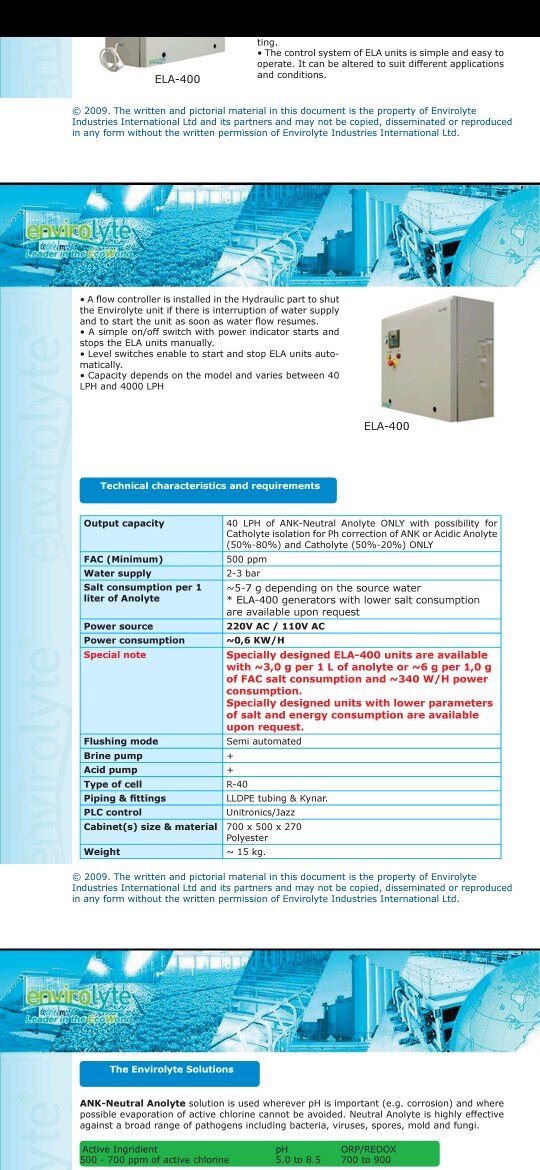 Envirolyte ela-400 anolyte generator, complete system for sale. Widely used in water treatment, food processing, agriculture, and healthcare for disinfection of surfaces, equipment, and water. System Includes the generator, water softener, filter, pressure regulator, 3 storage tanks, and 2 brine tanks. System is fully functional, tested and ready to use.