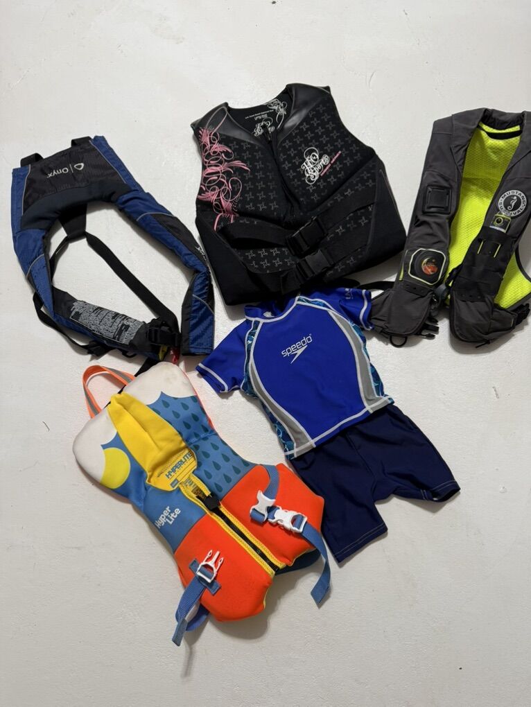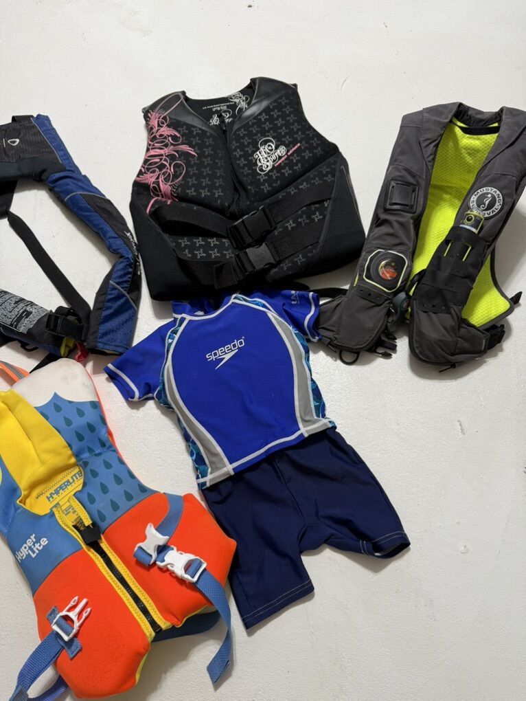 Speedo kids bodysuit S begin to swim $35 Hyperlite wake co infant sized $35 Adult black life jacket neoprene small $50 Onyx inflatable life vest $65 Mustang survival inflatable PFF $265