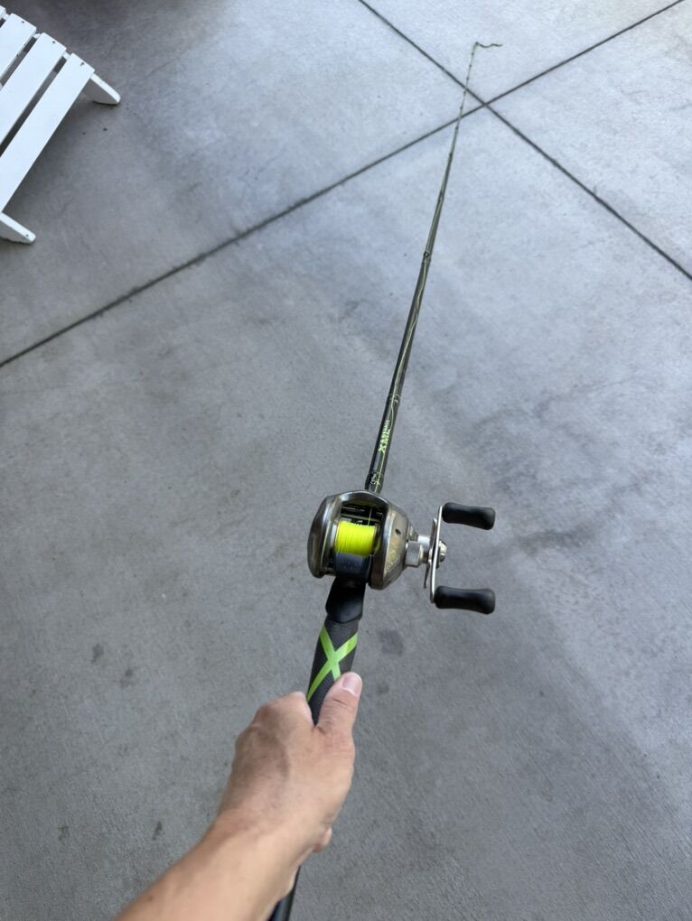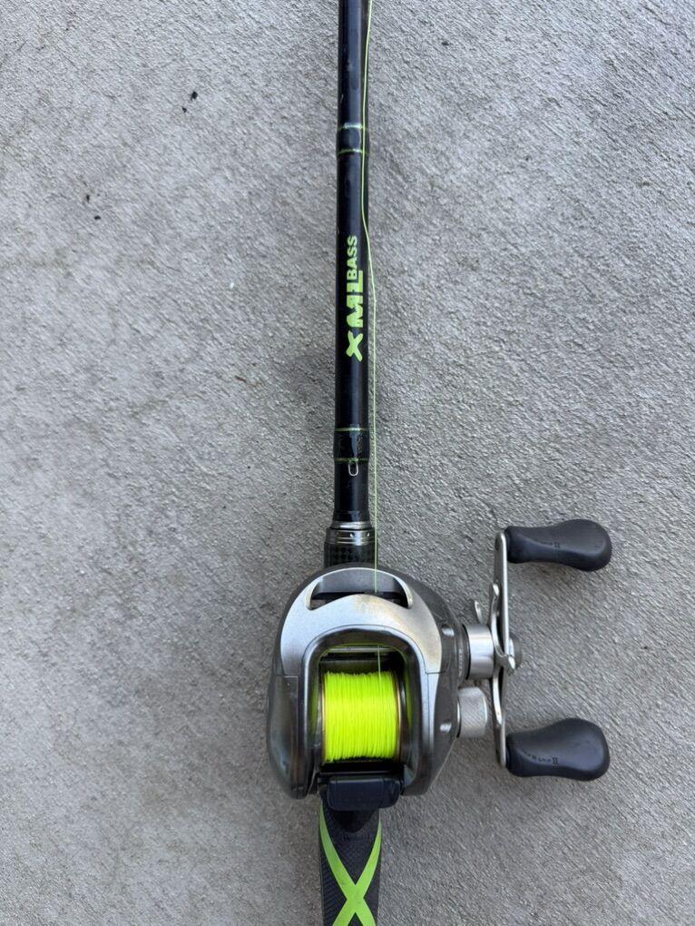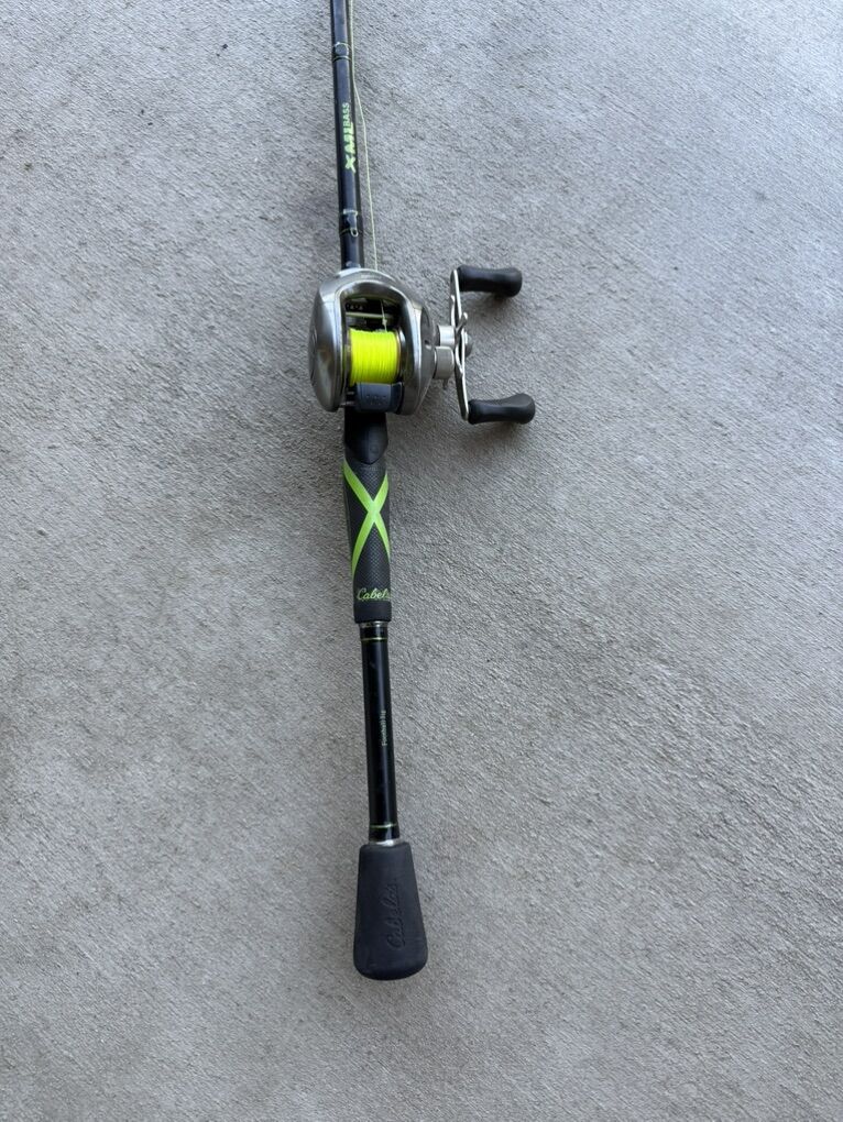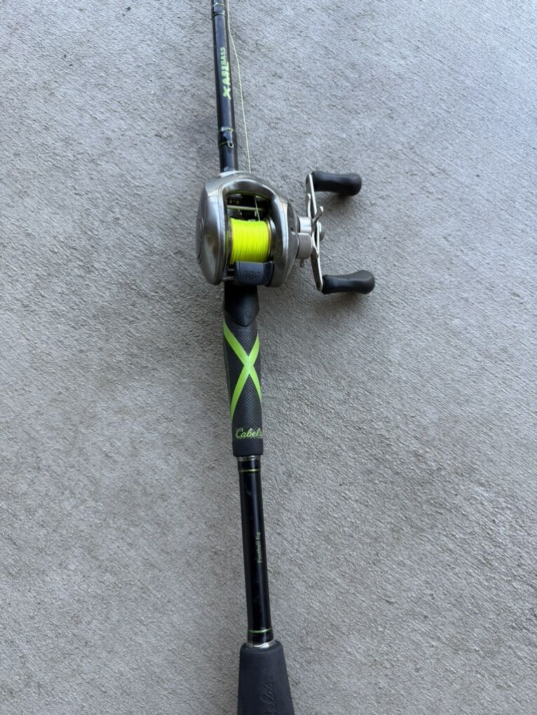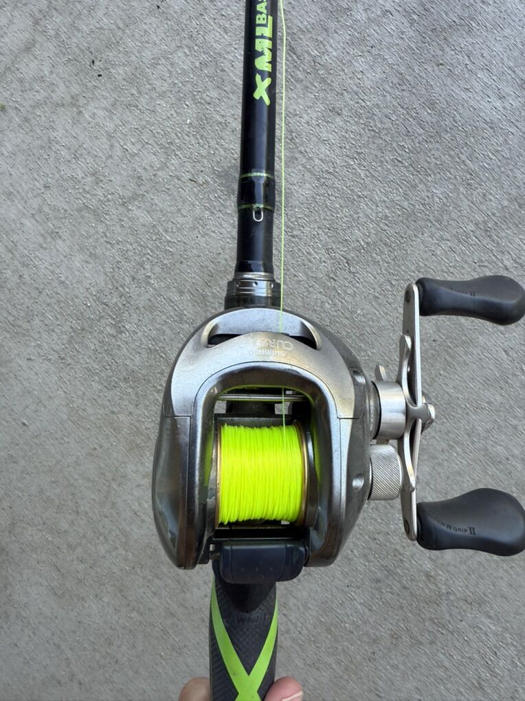 Cabela’s XMC bass rod shimano curado bait cast reel set 7’3” long 1 piece rod Line weight 17-30 pounds Lure weight 1/4- 1 1/4 ounce