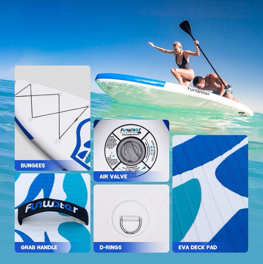 Each box includes: 1×inflatable paddle board 1×paddle 1×pump 1×storage bag 1×ankle cuff leash 1×dry bag 1x patch kit 3x fins