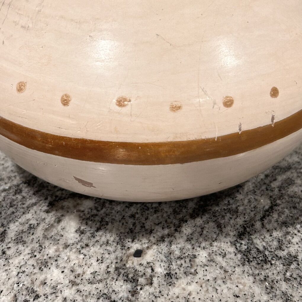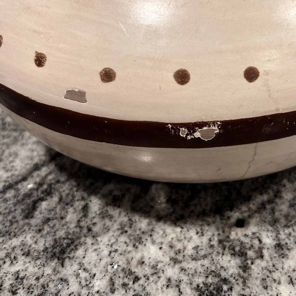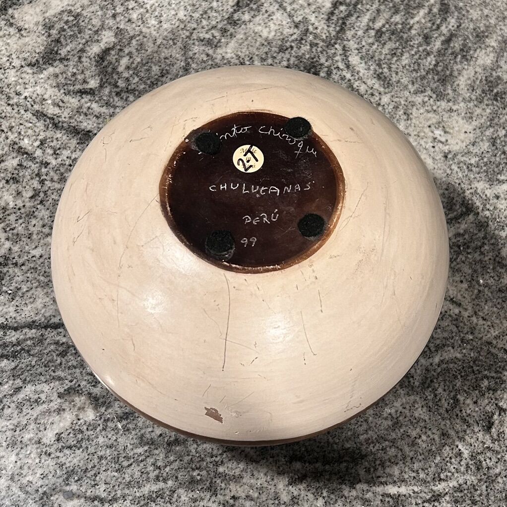 Jacinto Chiroque hand painted pottery jug originates from Chulucanas Peru. The bottom is signed and dated 99. No cracks but there are some scratches/smudges and a few surface layer chips (see photos). Text preferred or leave a voicemail and I’ll get back to you.