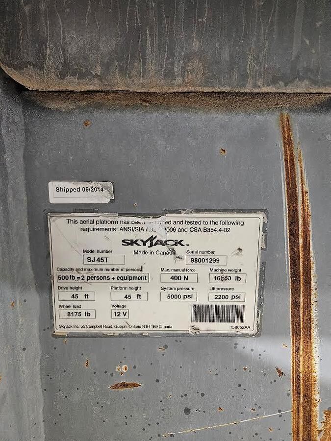 2014 Skyjack SJ45T 45' manlift with a 5' JIB Platform Height: 45’2” Work Height 51’2” Horizontal Reach: 39’9” S/N: 98001299 Located in Helena, MT Shipping Options Available See more at powerdrivesupply.com Financing Options Available