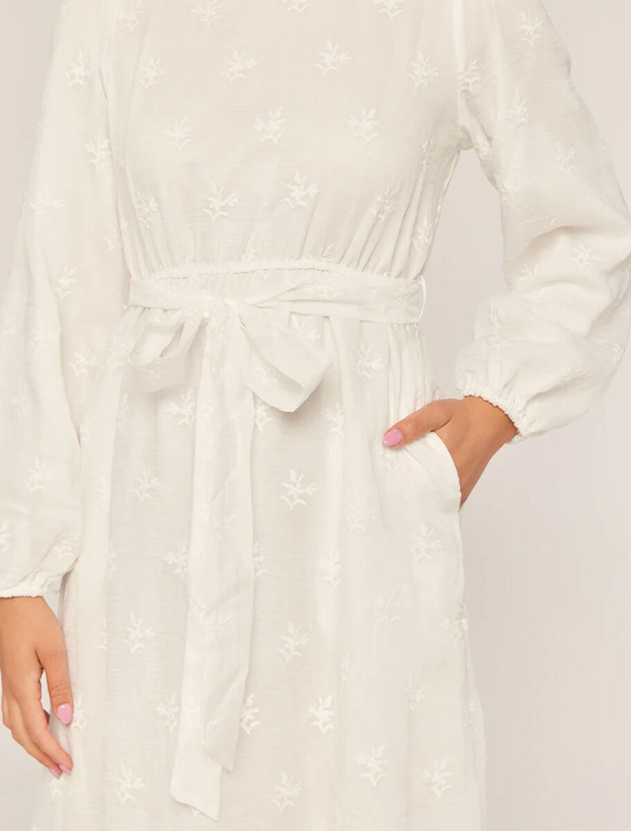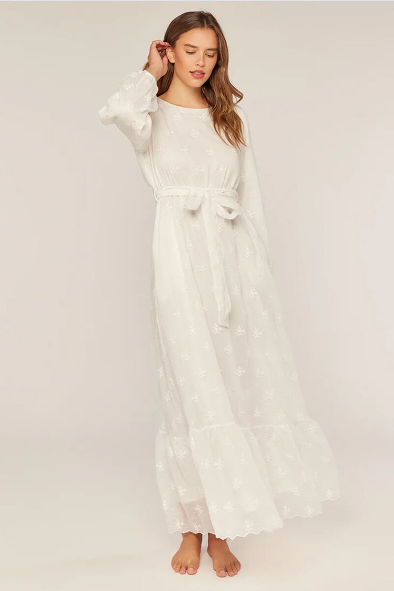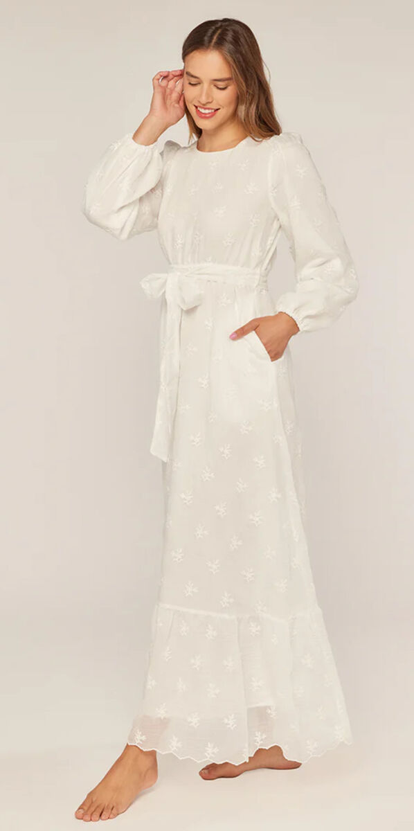 ApplePayThis perfectly pretty temple dress is made with a darling floral embroidered fabric with a lightweight and woven texture. It's casually charming with a round neckline and keyhole button in the back, an elastic waist, waist tie sash, long sleeves gathered with elastic at the ends, and a maxi length length with tiered hem, and featuring a dainty scalloped hem. It is also has the benefit of being fully lined with skirt pockets!