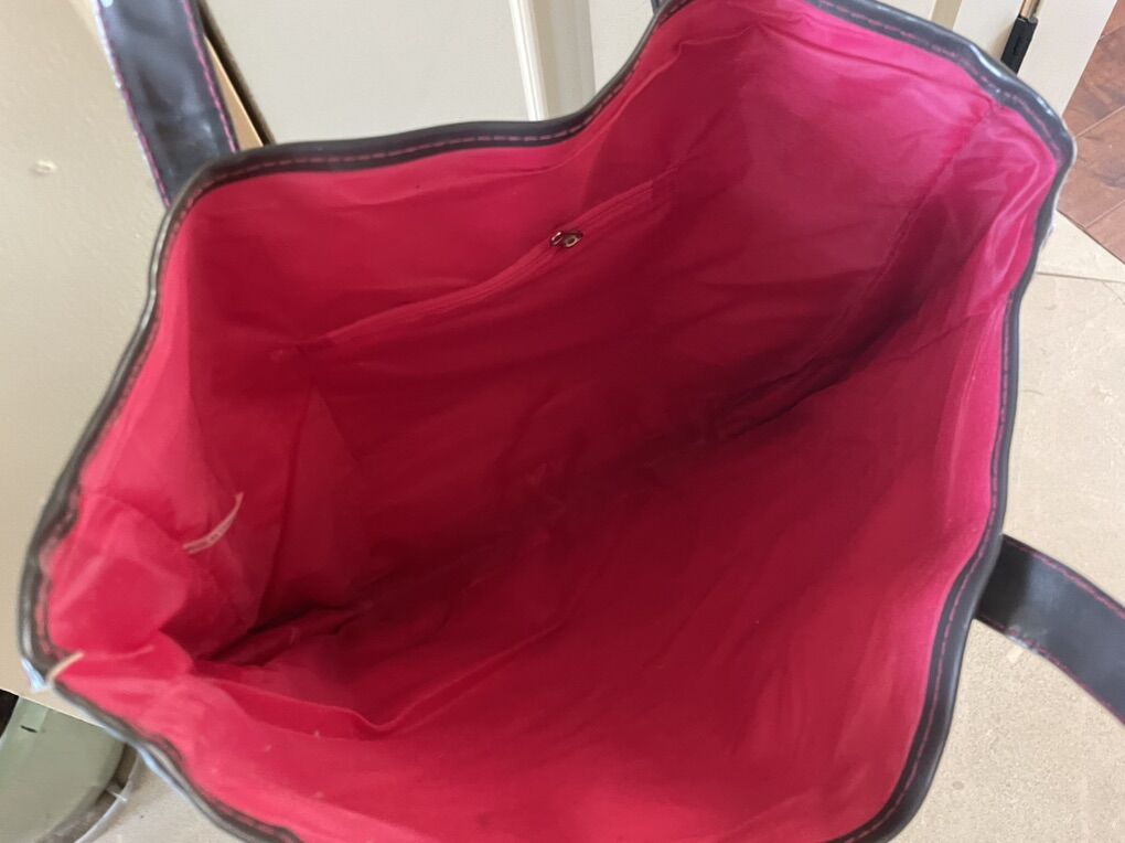 I have a dark gray tote bag with hot pink stitching. It has a shiny patent leather look. It says Time Out For Women in one corner. The inside is lined with hot pink and has one little zipper pocket. It has never been used. It is 12 1/2 inches tall (plus 8 more for the handles), 15 inches wide and 3 inches across on the sides and bottom. See my other ads for jewelry, artwork, home decor and more.