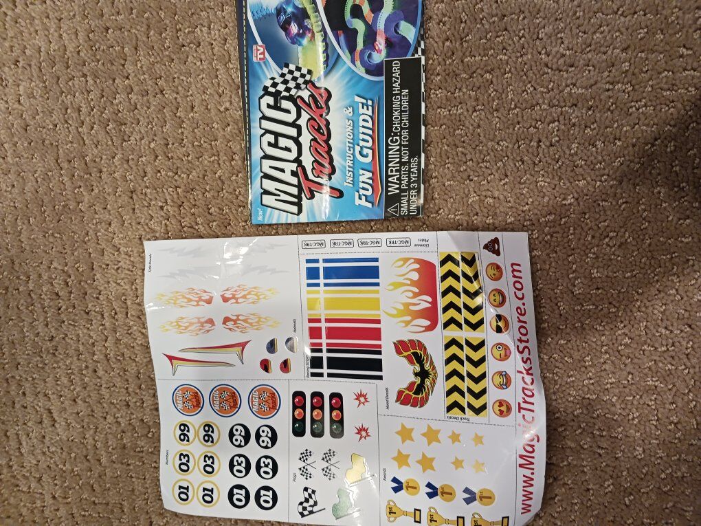 Cool toy for kids. I have 20 feet or so of track, and two cars that are battery powered and glow in the dark. You can set up the track however you choose. You can take apart and put the track together by simply disconnecting and reconnecting the pieces. It is a lot of fun, but my son has grown out of it. It comes with an instruction manual and stickers for the cars (if you want to use them). It also comes with 2 carrying bags for the track and cars. Please call or text me with any questions. Thank you.