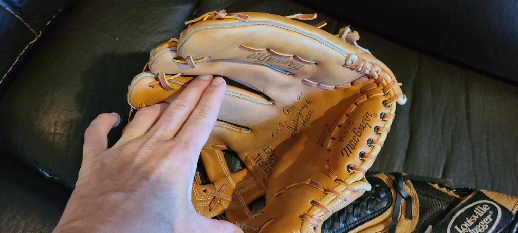 Black and brown is a left hand throw mitt (goes on right hand to catch) Louisville Slugger 12" lefty