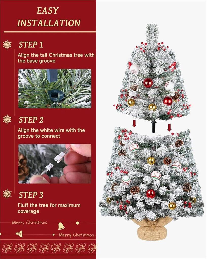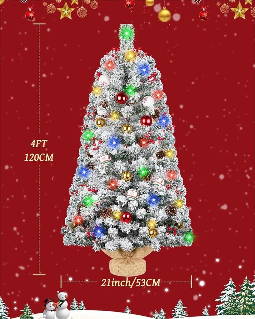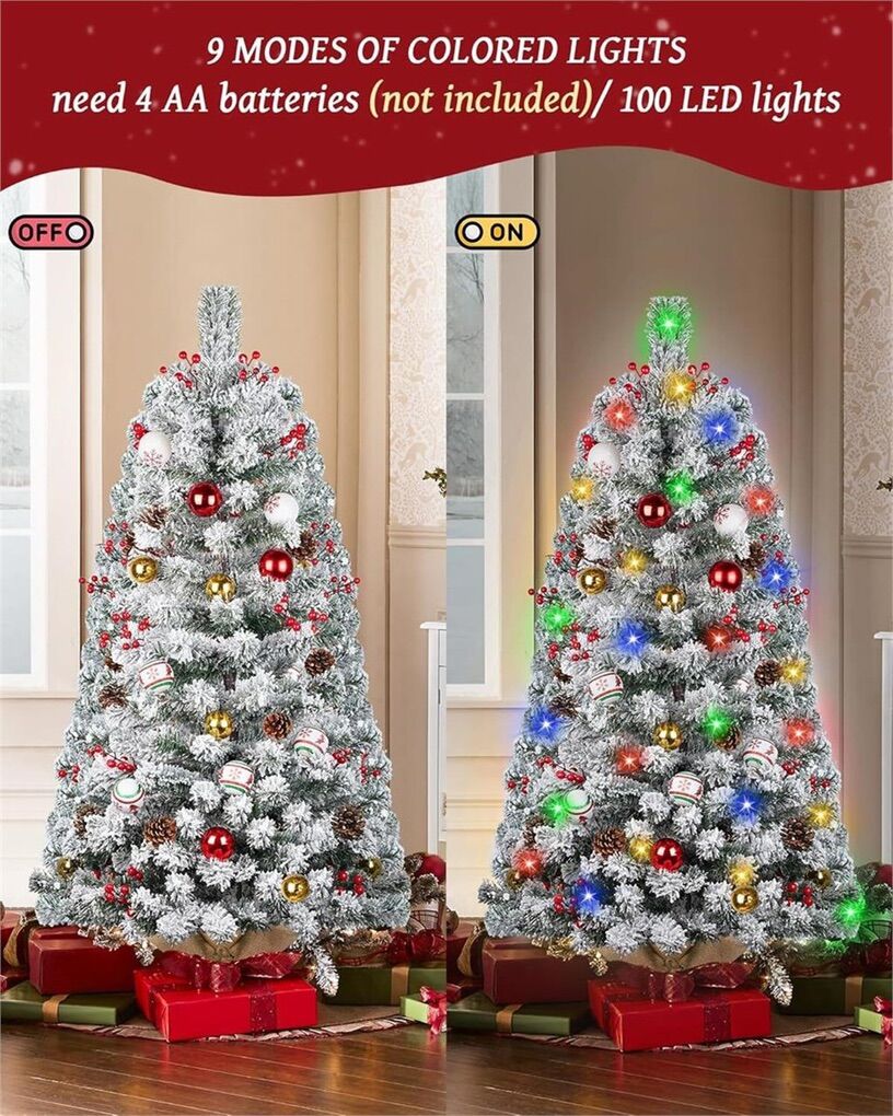 lighted Christmas Tree: This prelit Christmas tree, crafted in a snowy white spruce style, captures the magic of winter. Adorned with colorful ornaments, pine cones, berries and balls evenly spaced on each branch, it brings a unique holiday atmosphere to your home Easy Assembly: Quick and hassle-free setup in just two steps! Align the tail branch to the trunk, connect the light strip, and unfold the pine branches to achieve the perfect, full shape in minutes Prelit with Colorful Lights: Standing 4 feet tall, this flocked christmas tree is pre-lit with 100 LED lights, featuring 8 flash modes and a convenient 6-hour auto-off timer. Runs on 4 AA batteries (not included), offering energy efficiency and safety for use in any room Durable, High-Quality Design: Constructed with flame-retardant PVC branches, this tree stays upright with a strong base, ensuring stability so you can enjoy it worry-free throughout the holiday season Perfect Christmas Decor: Experience the warm holiday spirit with the DDHS Christmas tree.